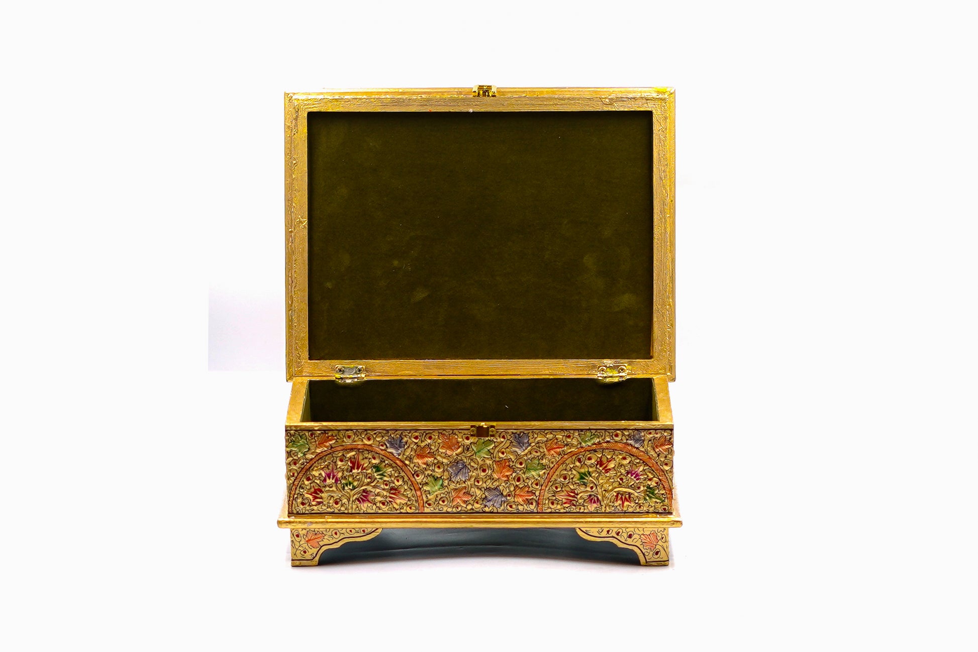 The box features an overall luxurious golden base, adorned with rich floral detailing in shades of red, green, and pink, creating a shimmering embossed look that reflects reverence and grace. Finished with a glossy lacquer for long-lasting shine and protection, it is both a functional item and a stunning piece of devotional décor.