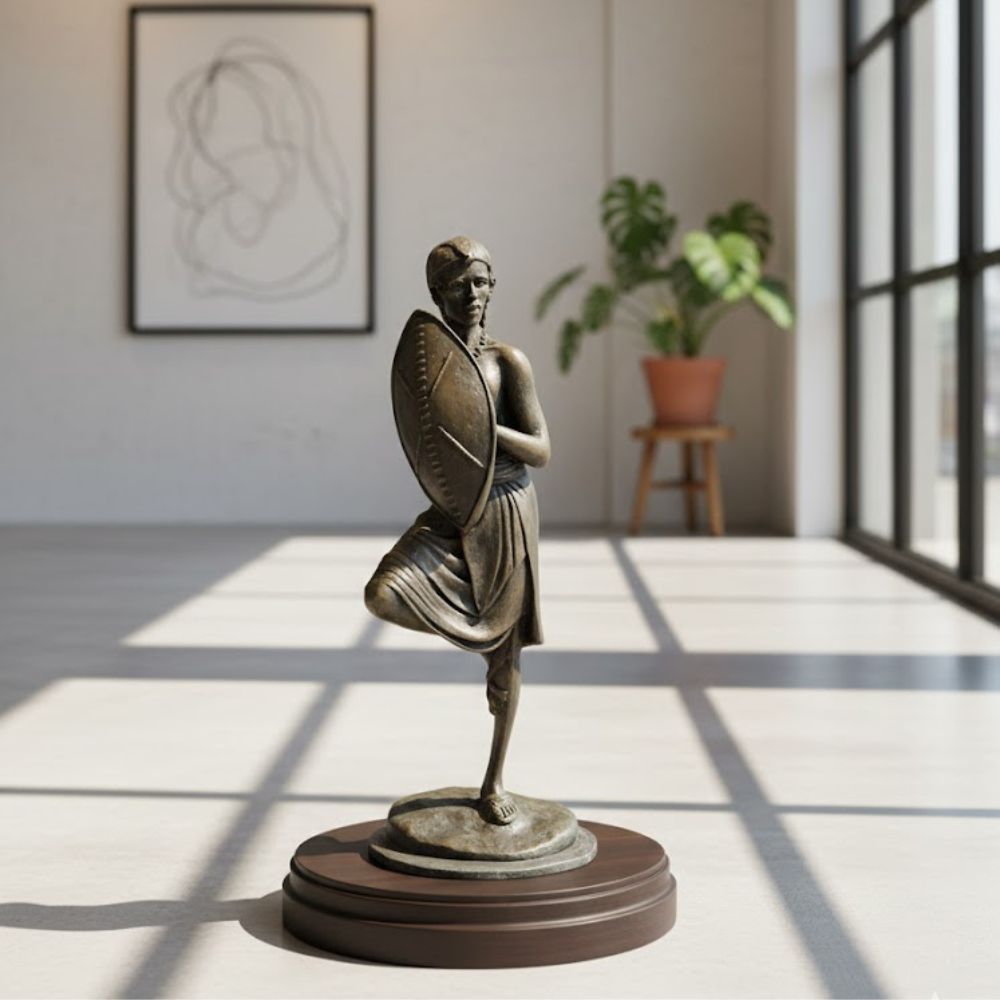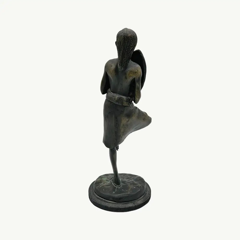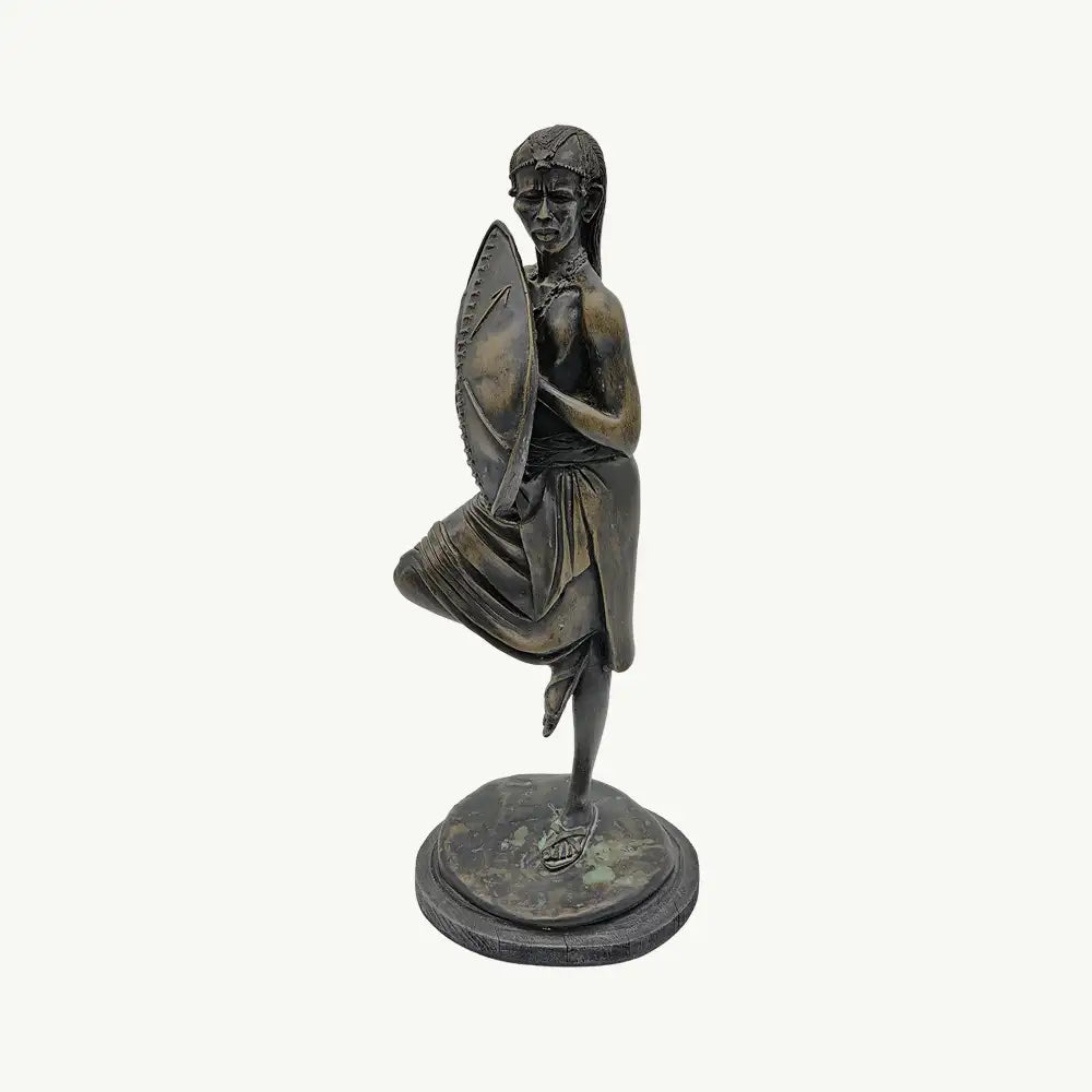 This collectible sculpture depicts a warrior, likely a Maasai or similar East African tribe member, in a classic standing pose often referred to as a ""Flamingo Pose"" (standing on one leg). The figure is meticulously hand-carved from wood and finished with a rich, dark stain that mimics a bronze-green patina. This powerful item combines dynamic posture with cultural realism, making it a captivating Heirloom display item for a den, study, or any collection focused on African culture, tribal history, or ethnographic sculpture.