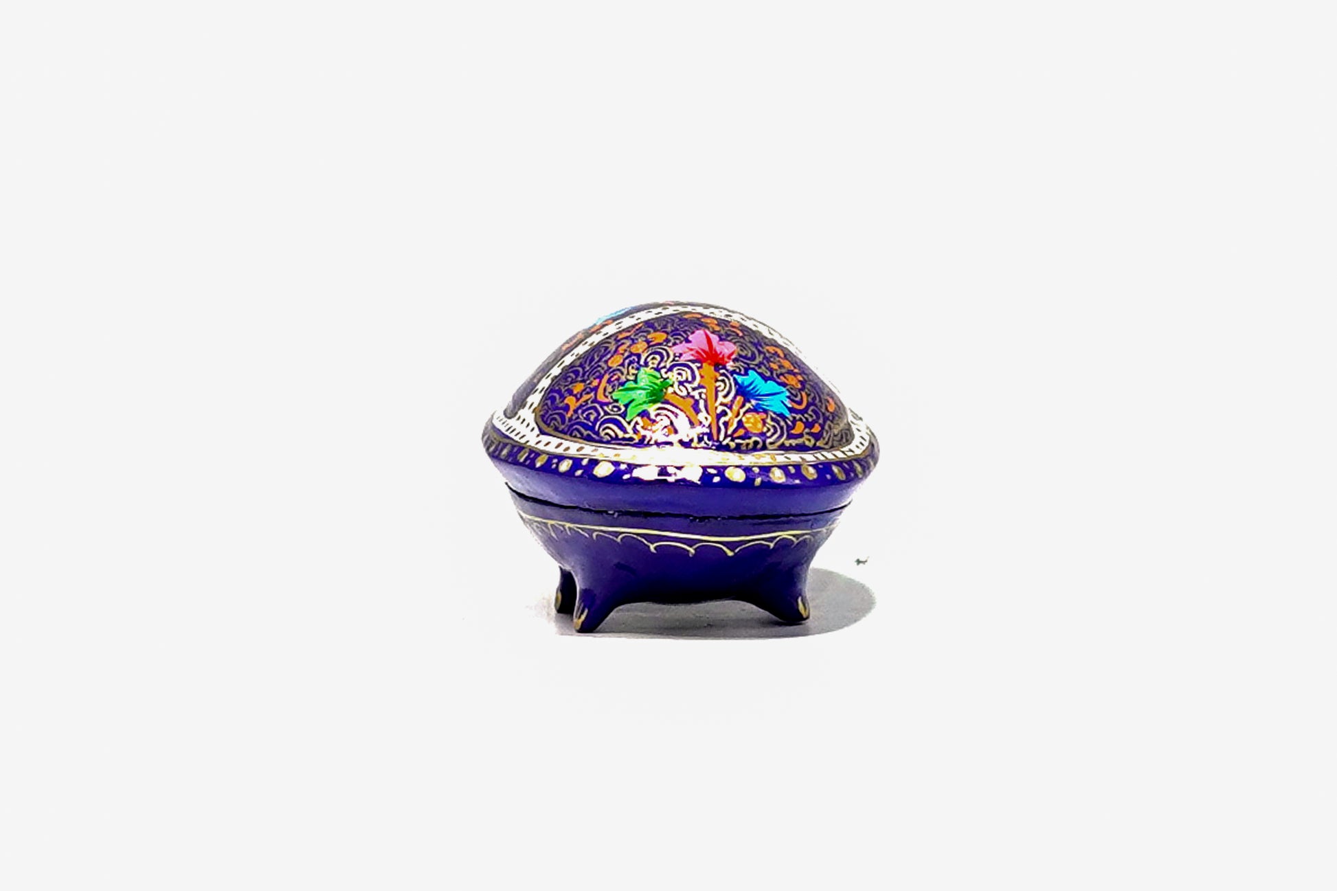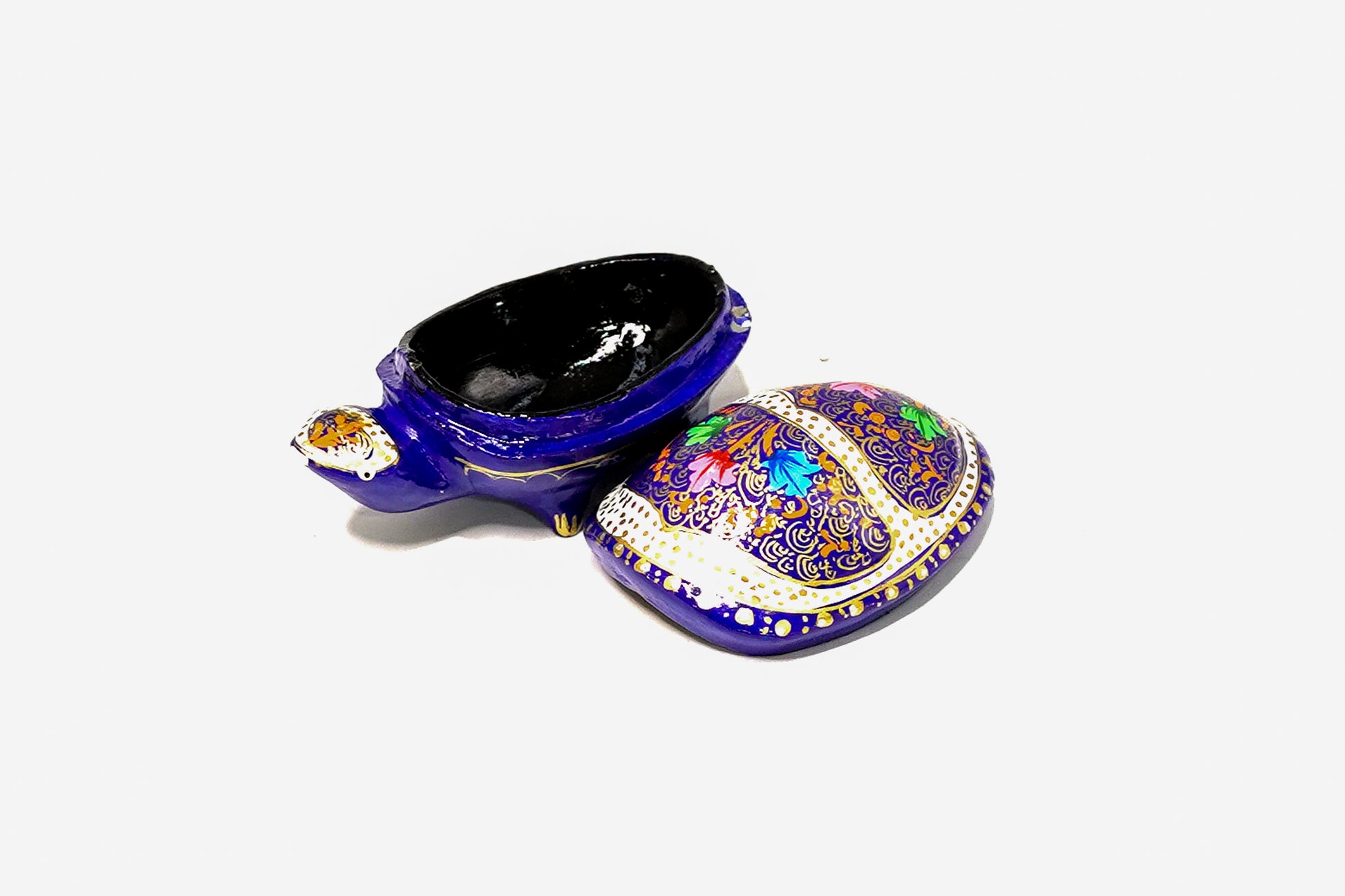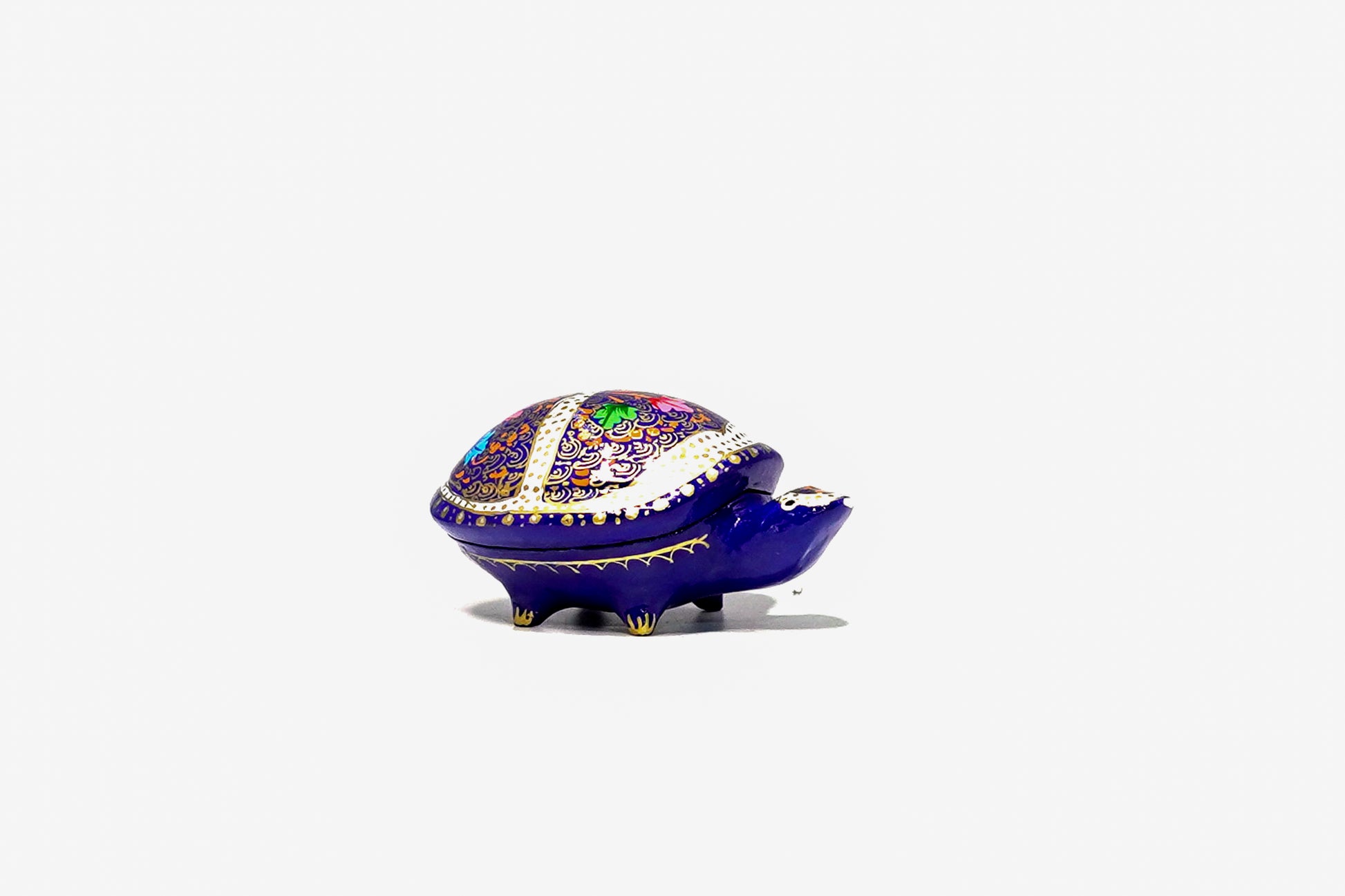 "This charming turtle is a beautiful and functional piece of art, showcasing the skilled craftsmanship of paper mache artisans. Its body has a rich blue base, while its shell is a masterpiece of intricate, multi-colored patterns. The top of the shell lifts off to reveal a small storage space, making it a perfect decorative trinket box for your small treasures. As a symbol of longevity and wisdom, this unique piece adds a touch of charm and meaning to any room.