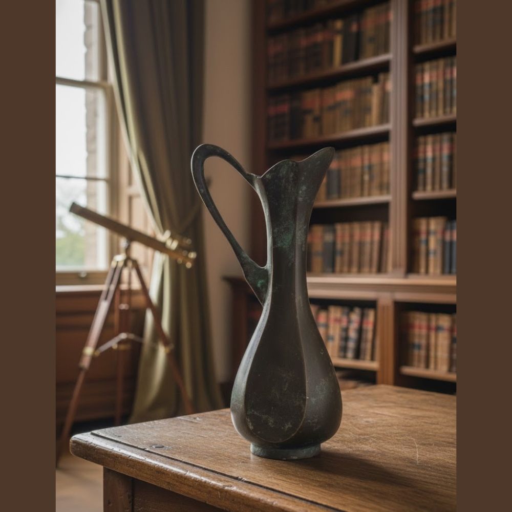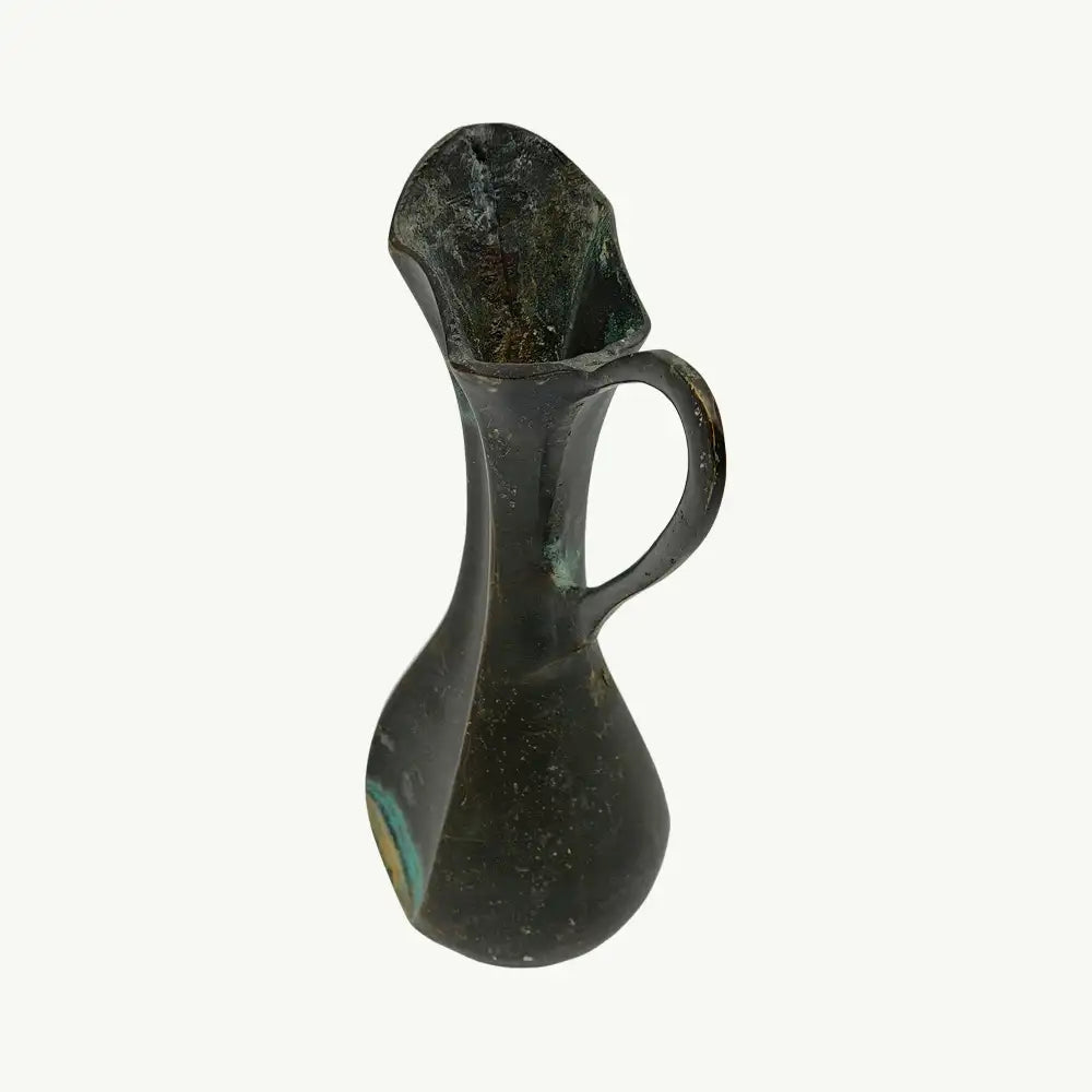 "This beautiful piece is an Antique Copper Ewer, a stunning artifact that blends functional form with elegant design. Crafted entirely from copper, this pitcher features a slender, elongated neck that flares out into a distinctive, decorative fluted (scalloped) rim, ideal for pouring.The body tapers gracefully from a wide base to the narrow neck, giving it an appealing, classic silhouette. A single, flowing handle arches from the neck to the upper body, providing balance and utility.The copper material displays a rich, naturally acquired dark patina, ranging from deep brown to hints of green-blue (verdigris), which speaks to its age and history. This natural weathering enhances its antique charm, making it a perfect decorative piece for collectors of historic metalware, Renaissance-style decor, or those seeking a rustic, aged aesthetic.