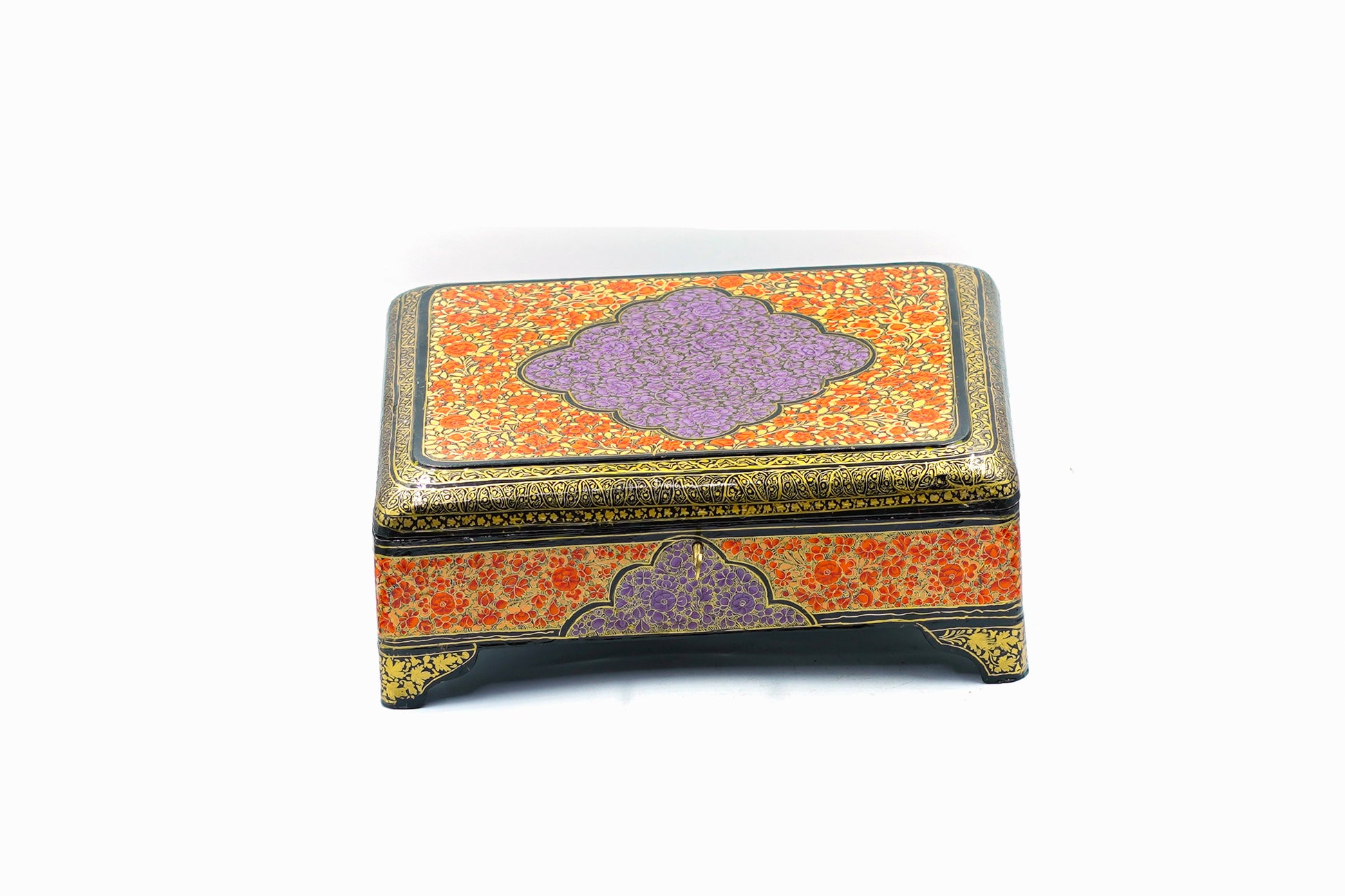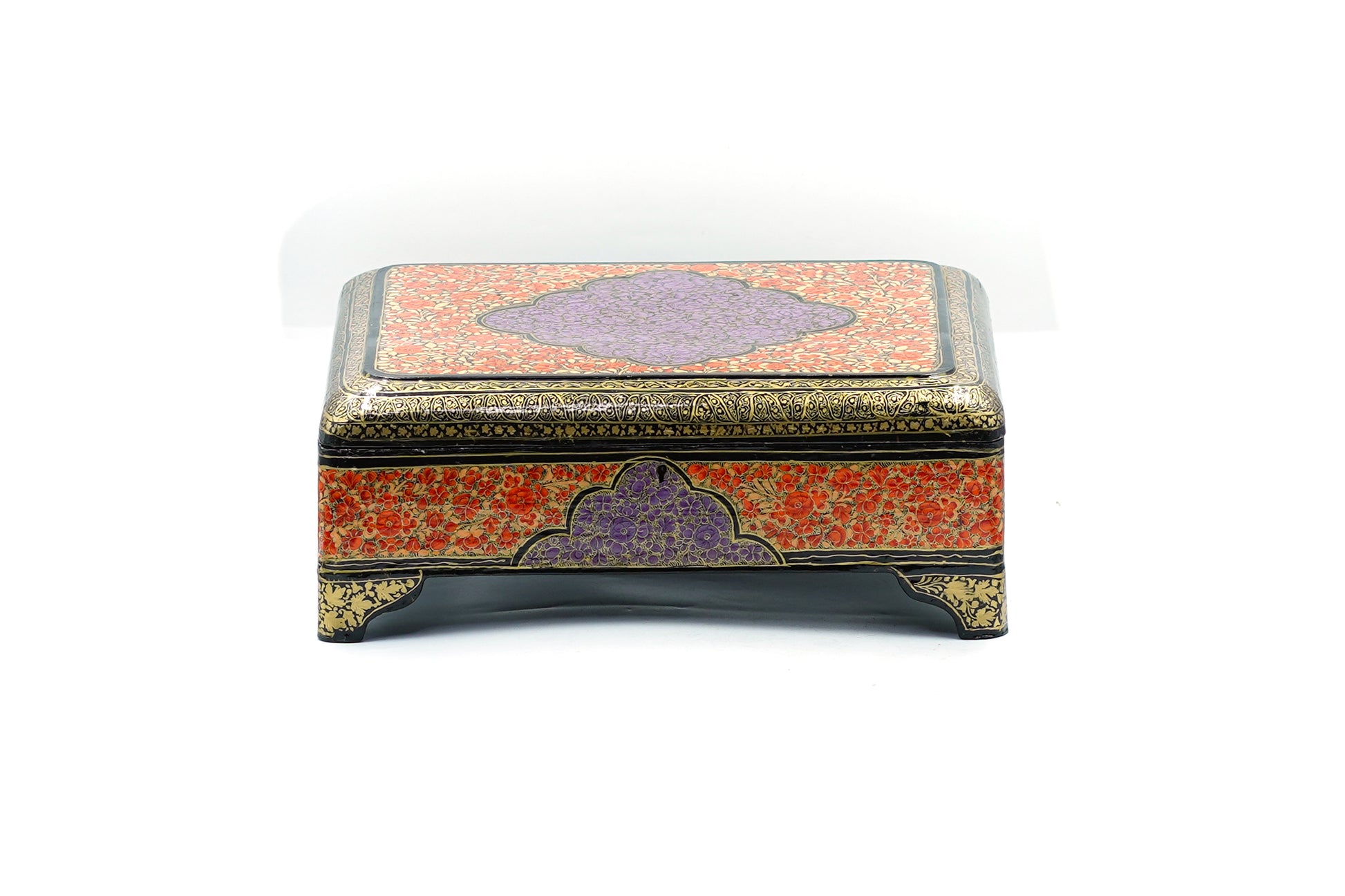 Store your treasures in timeless elegance with the Royal Bloom Paper Mache Jewelry Box, a stunning handcrafted piece made in the heart of Kashmir. Crafted using traditional paper mache techniques, this box features an ornate floral design with a rich color palette of red, orange, gold, and lavender purple, highlighted with a high-gloss finish for a luxurious touch.