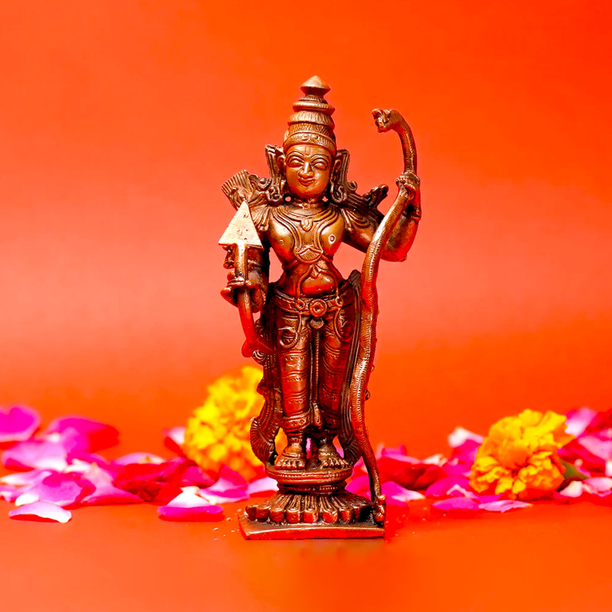 Embrace an aura of divine grace and righteousness with this beautifully crafted idol of Lord Rama. He stands in a heroic posture, holding his divine bow and a single, poised arrow, symbolizing his commitment to dharma. The idol's features are rendered with exquisite precision, from his serene expression and intricate crown to his finely detailed garments. The rich, wood-like patina gives the piece a timeless and dignified presence. This pure piece serves as a magnificent addition to your puja room, altar, or any space seeking an infusion of peace, strength, and spiritual harmony.