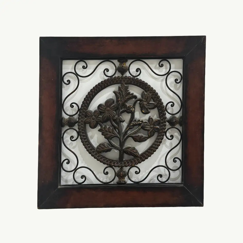 Enhance the elegance of your space with this sophisticated wooden wall frame featuring intricate ironwork. The frame showcases a delicate floral design, crafted with care to highlight its ornate curves and detailed petals. The combination of rich brown wood and dark iron gives this piece a timeless appeal, making it an ideal addition to both modern and traditional interiors. Whether adorning your living room, hallway, or office, this frame creates a refined touch to any wall. The carefully balanced structure of metal and wood complements various décor styles, creating a harmonious visual focal point.
