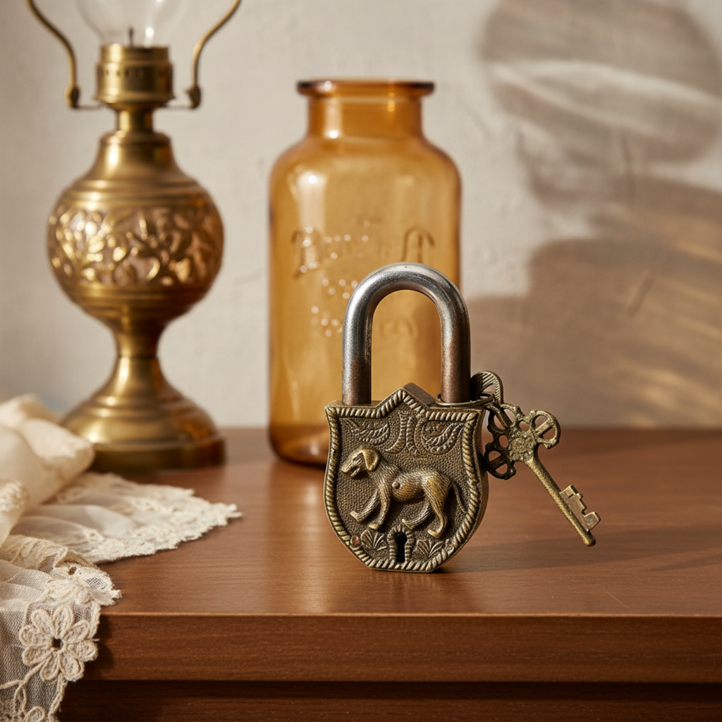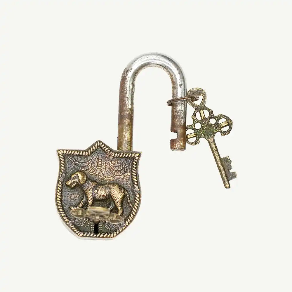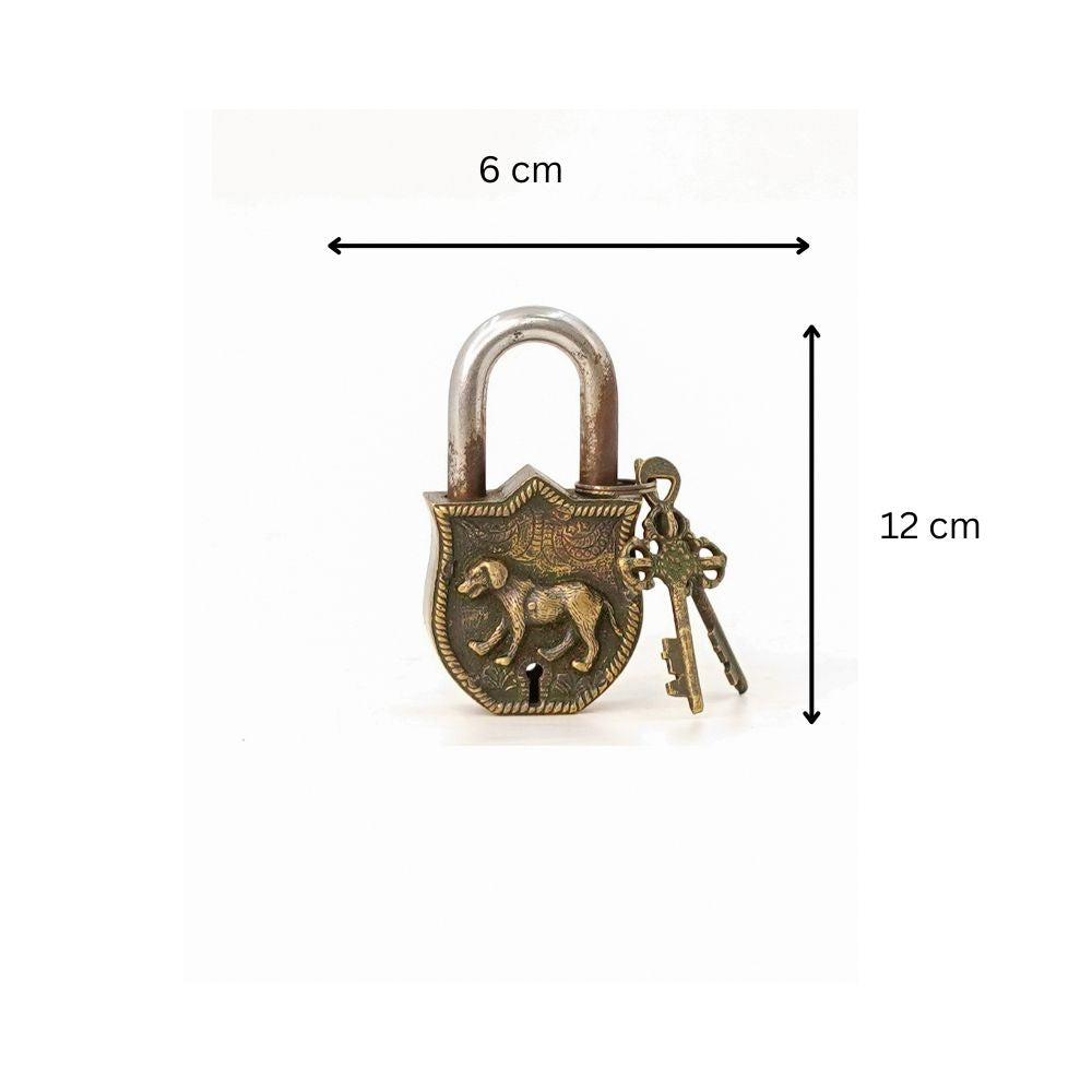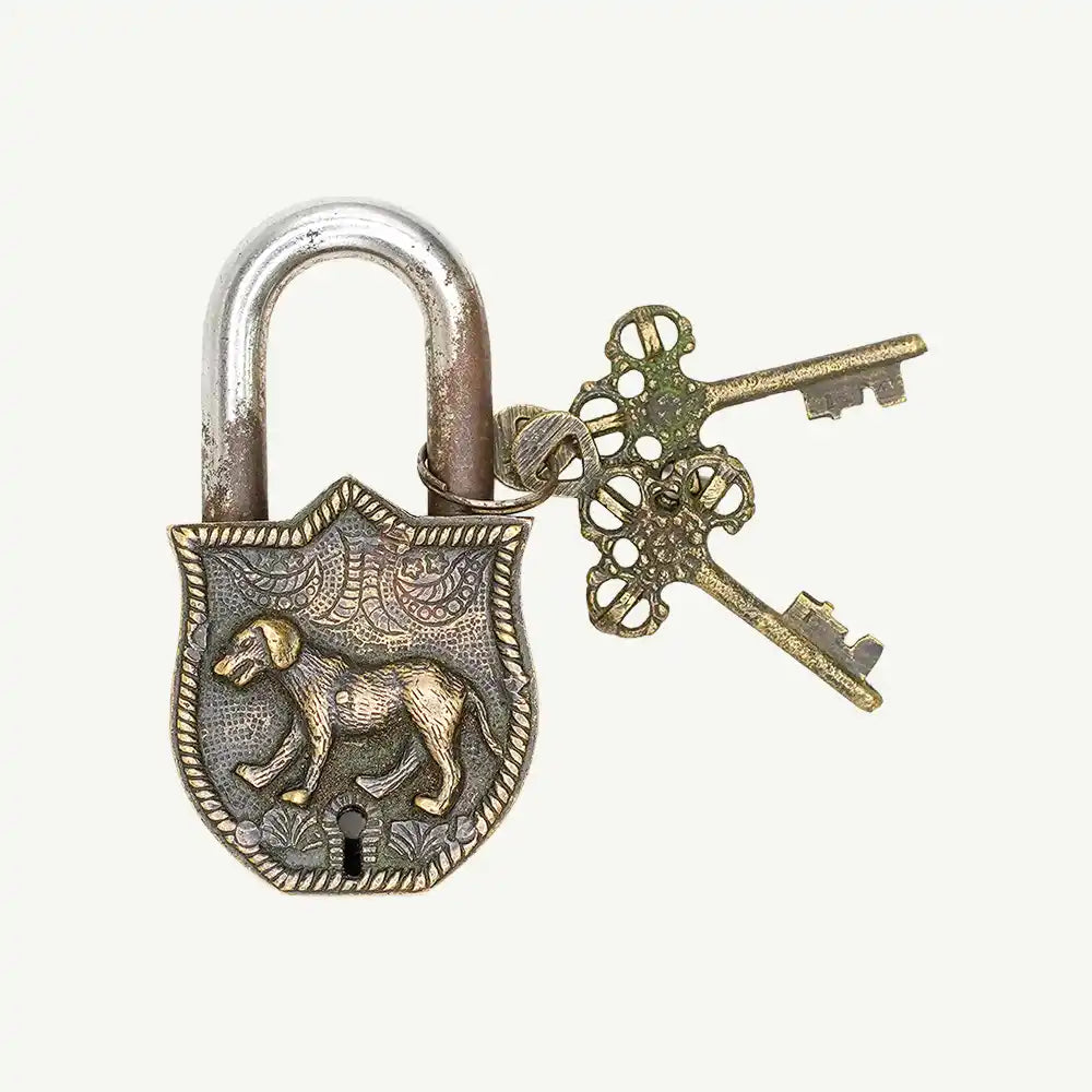 Embrace a sense of enduring strength and loyal protection with this distinctive, decorative lock. The cast metal body is shaped like a shield and features a striking, raised relief of a proud canine figure—likely a dog or a wolf—on its face. The piece has a darkened, textured finish that accentuates the detailed relief and gives it a powerful, rustic character. The accompanying keys are also crafted in a stylized, matching design. With a substantial weight and a solid feel, this lock is not just a security measure but a compelling artistic relic. It serves as a unique accent piece for a chest or box, a paperweight, or a distinctive collectible with a story to tell.