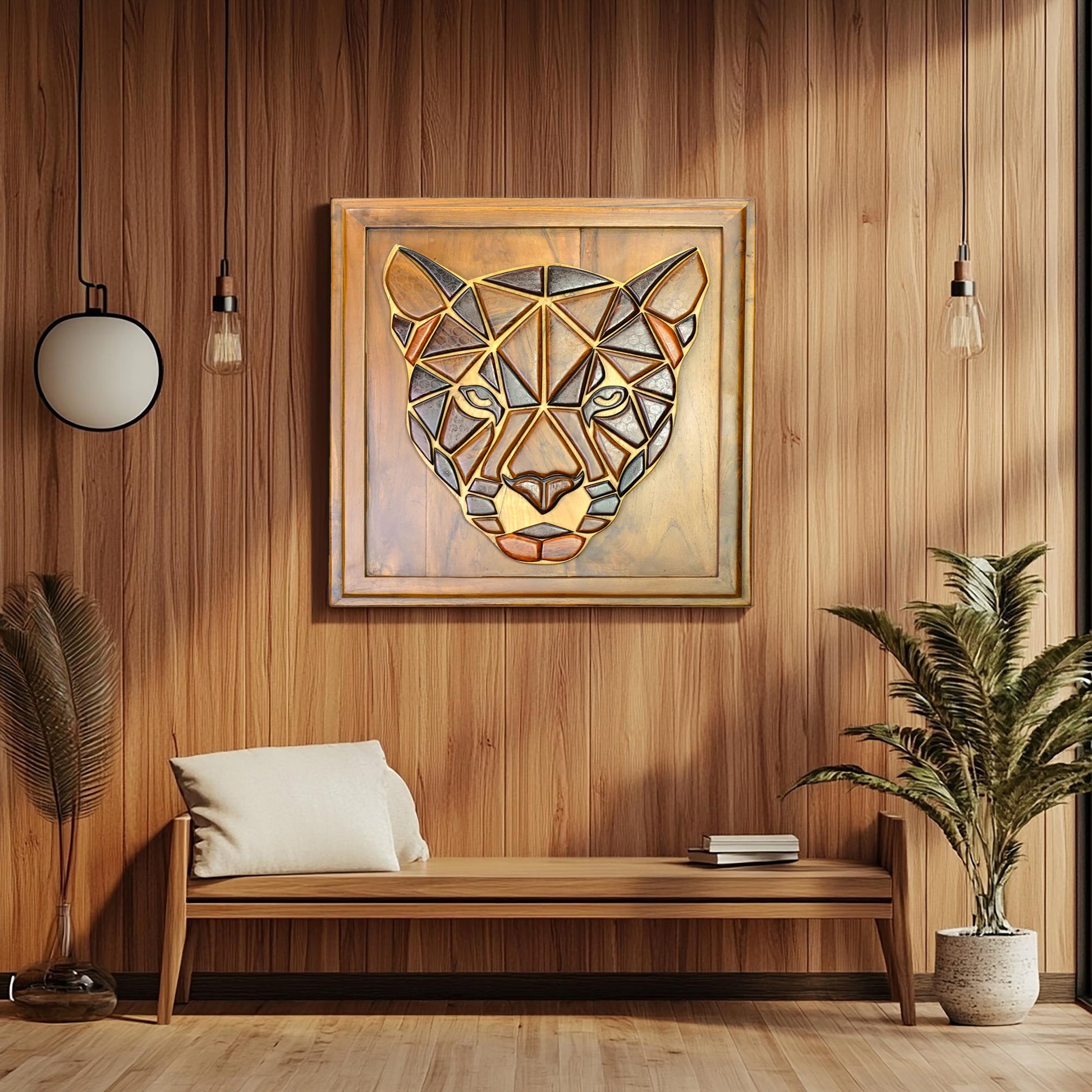 This captivating wooden art panel presents a powerful leopard head in a stunning geometric style. The design, composed of multiple tones of wood, creates a beautiful, abstract mosaic that highlights the animal's fierce and elegant features. Each piece of wood contributes to the overall texture and depth, reflecting exceptional craftsmanship. This unique and eye-catching frame is a bold statement piece for any modern or nature-inspired space.