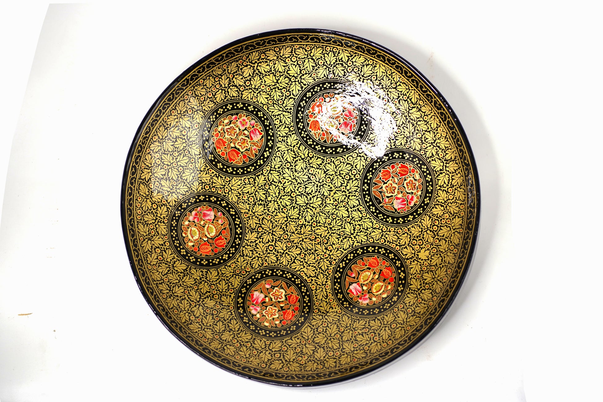 Elevate your wall décor with the timeless elegance of the Zewar Gul Wall Plate, meticulously handcrafted in Kashmir using the age-old paper mâché technique. Featuring a luxurious black base with intricate golden detailing and floral medallions in soft reds and pinks, this wall plate evokes the charm of vintage Kashmiri ornamentation.