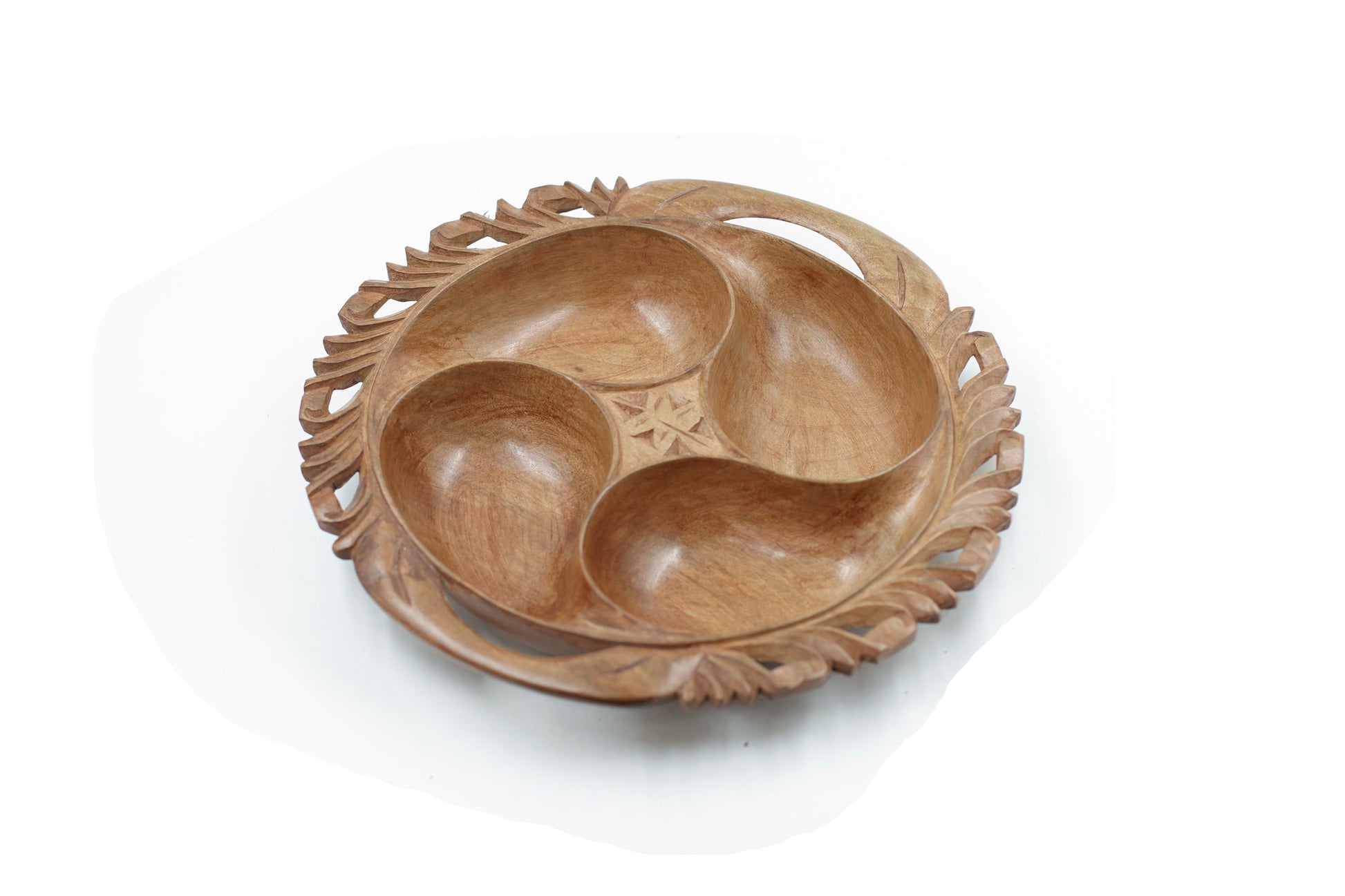 Elevate your entertaining with the ""Gourmet Paisley"" Hand-Carved Walnut Dry Fruit Tray. This exquisite serving tray is a testament to sophisticated craftsmanship, meticulously carved from rich, authentic walnut wood. The tray features a unique design with four smooth, sculpted sections, perfect for presenting a variety of dry fruits, nuts, or candies.