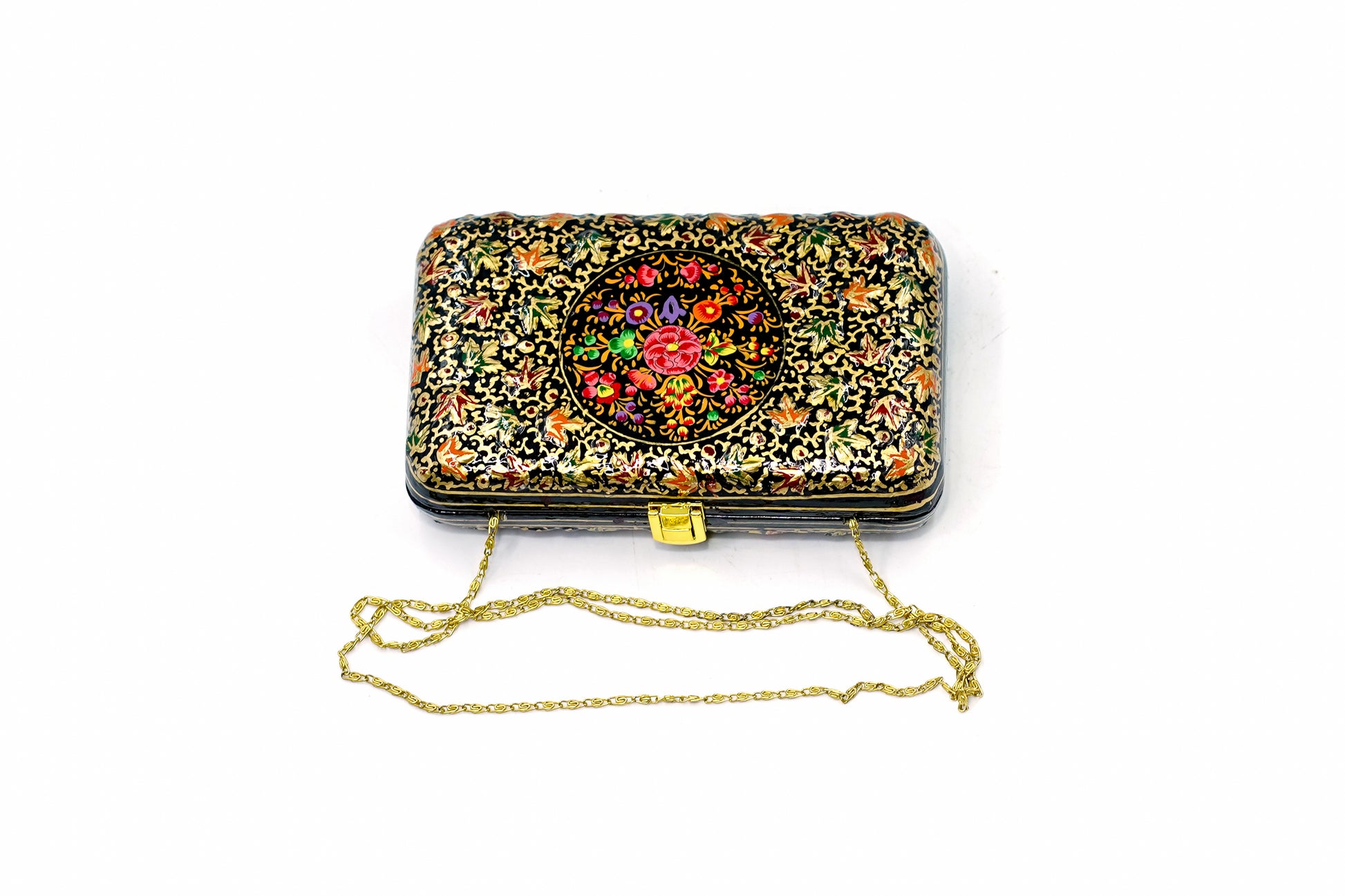 Elevate your accessory game with the Zari Garden Clutch, a stunning handcrafted purse made using traditional paper mâché techniques from Kashmir. This elegant clutch features intricate hand-painted floral motifs in vibrant hues—set against a richly textured black base with golden highlights that resemble fine Zari embroidery.