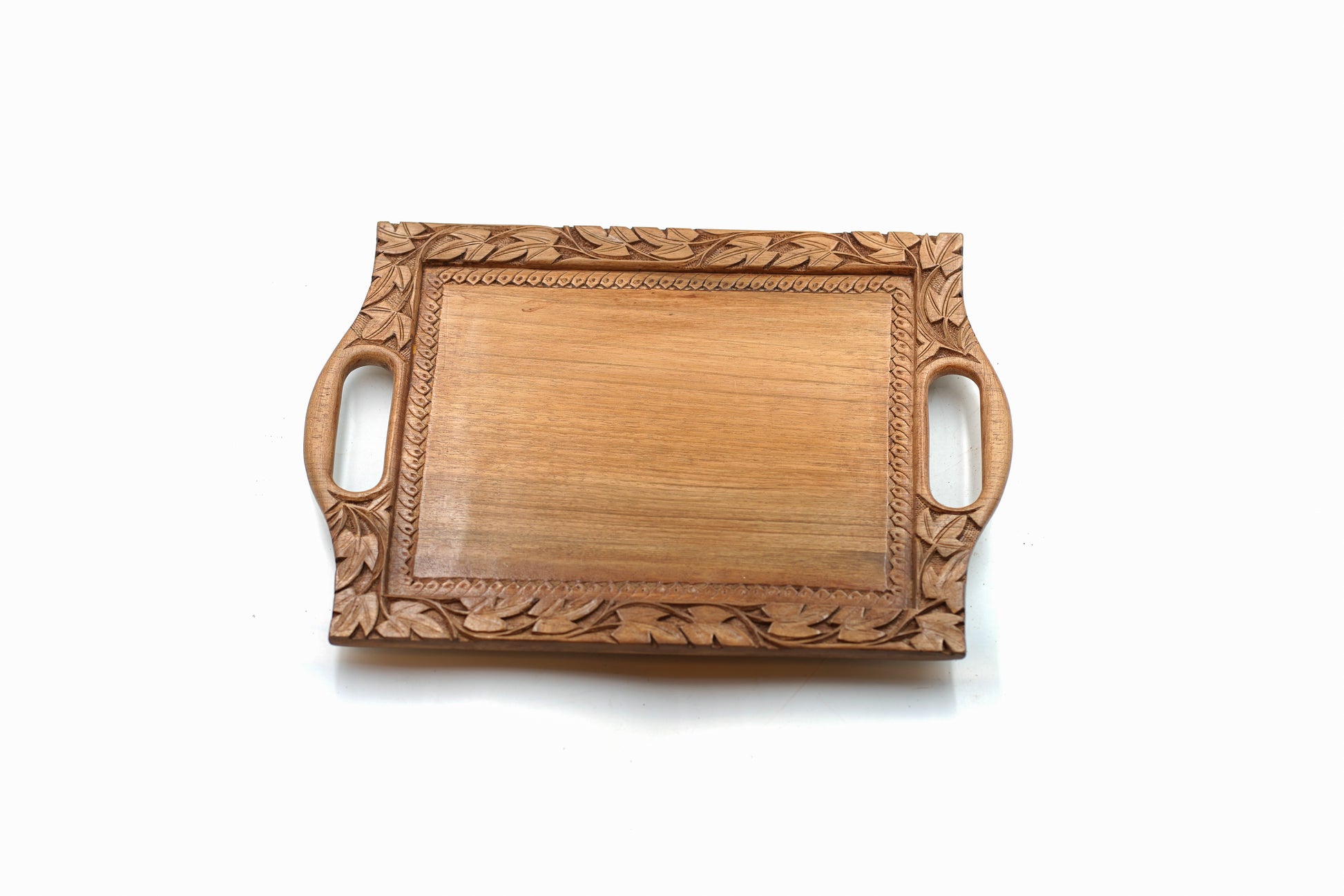 This beautiful serving tray combines elegance with practical design, making it perfect for entertaining. The tray is polished to a smooth finish, highlighting the beautiful grain of the walnut wood. It features a gracefully detailed pattern along its raised border and includes two handles for easy carrying. This piece is ideal for serving tea, coffee, or snacks, and it also makes a lovely decorative item for your coffee table or ottoman when not in use.
