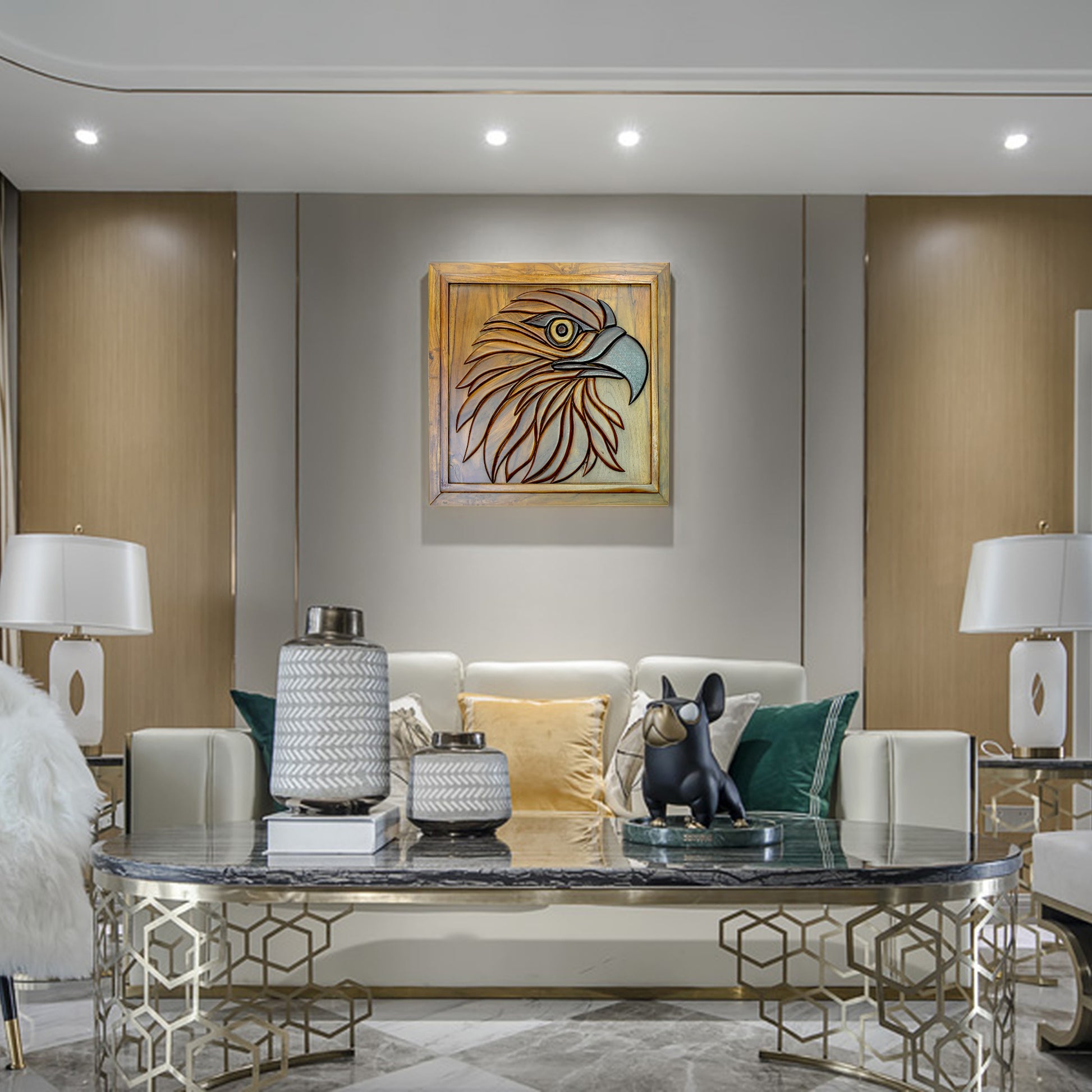 This powerful and highly-detailed wall art features a hand-carved eagle head, a timeless symbol of strength, freedom, and vision. Expertly sculpted from high-quality teak wood, the piece highlights a beautiful array of natural wood tones, from light honey to deep brown. The intricate feather texture and powerful gaze are brought to life through skillful carving and a subtle polish, making it a bold and captivating centerpiece for any room. This is a perfect statement piece for those who appreciate detailed craftsmanship and the majestic beauty of nature.