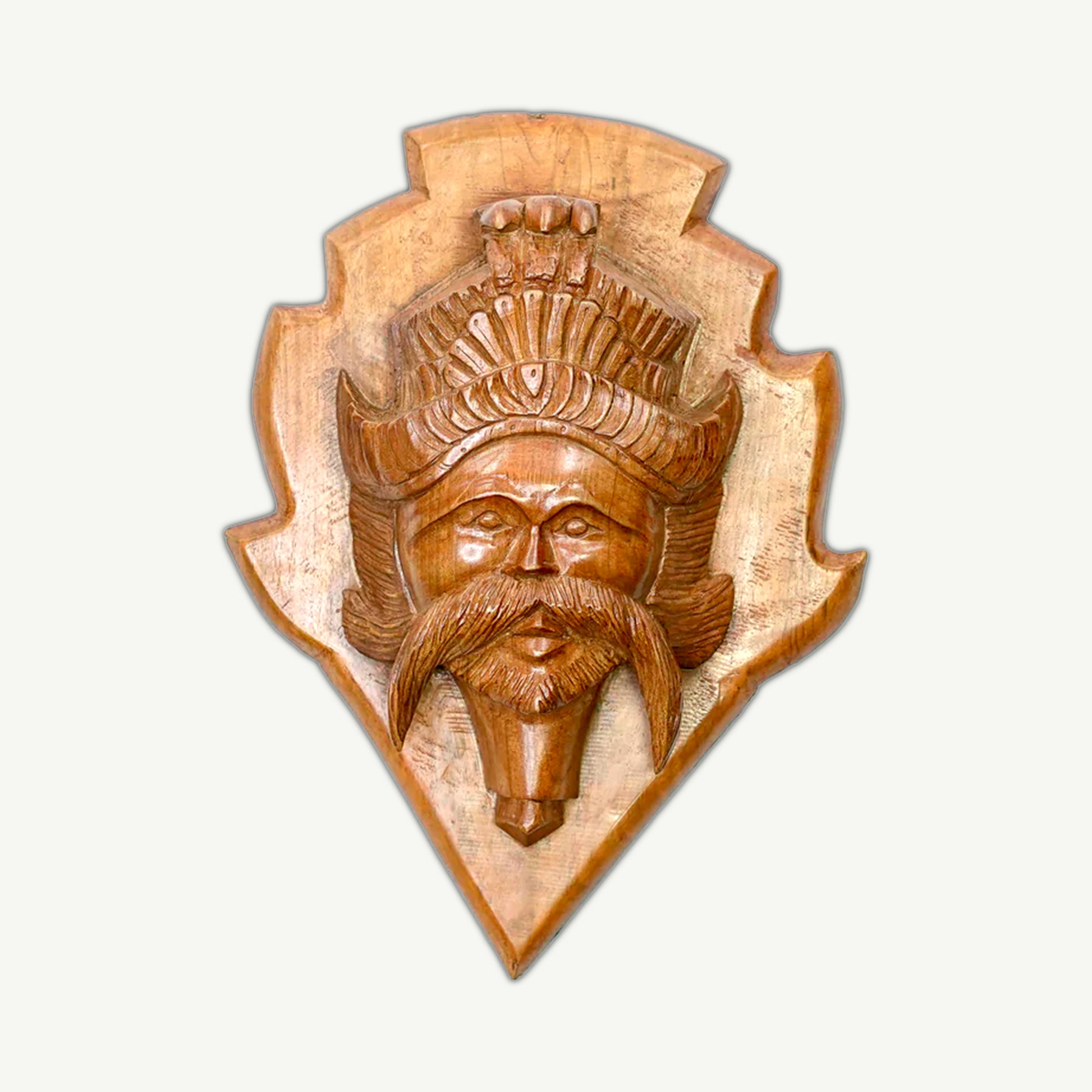 This unique wooden frame features a beautifully detailed depiction of a regal king, complete with a moustache and ornate headdress. The rich, brown wood tones and intricate sculpting bring a sense of royal dignity and masterful craftsmanship to this piece. Perfect for adding a touch of classic elegance and historical charm to any room, this frame serves as a captivating wall accent on its own or can surround a small photo or emblem. It's an ideal choice for those who appreciate art that combines functionality with timeless decorative appeal.