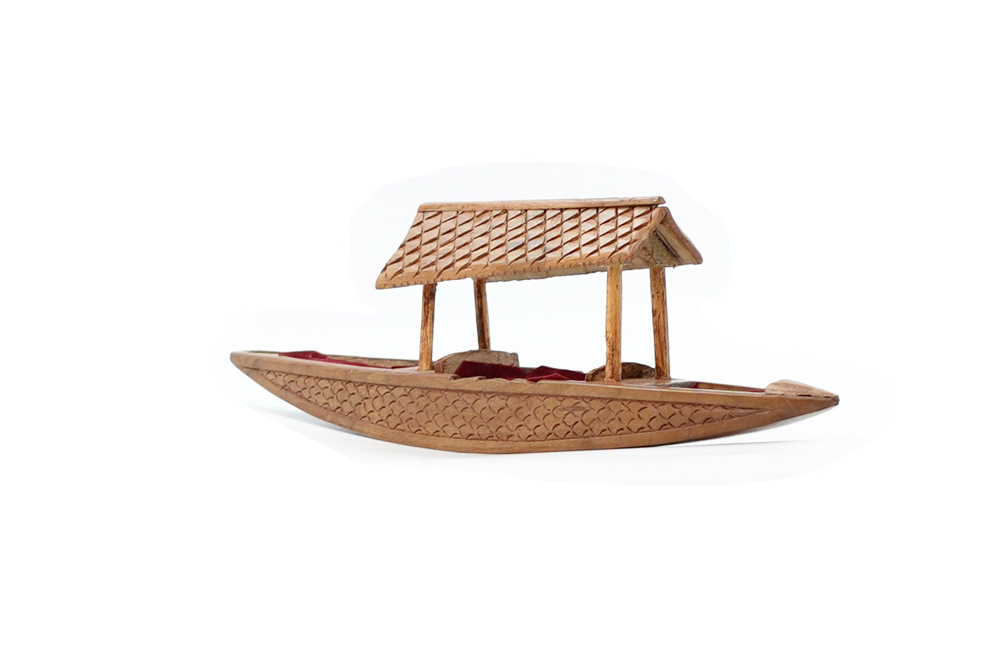 Drift into a world of tranquility with this exquisite Kashmiri Houseboat (Shikara) Miniature. A piece of art meticulously crafted from rich walnut wood, this showpiece is a tribute to the serene elegance of Dal Lake. The delicate hand-carvings and subtle fabric accents capture the peaceful allure of Kashmir's iconic watercraft, bringing a whisper of its legendary beauty into your home. This miniature is a symbol of calm and a stunning conversation starter, perfect for those who seek to infuse their decor with culture and a touch of the extraordinary.