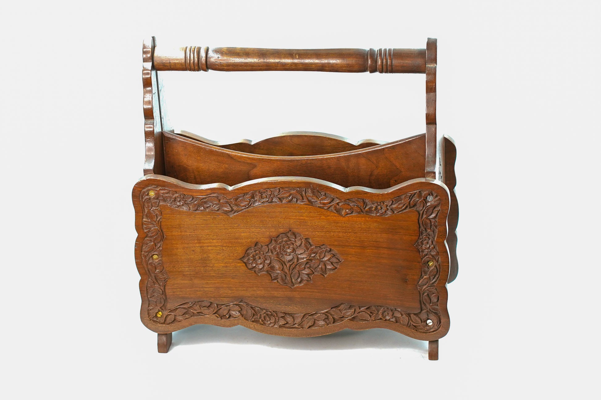 Elevate your living room or office with this exquisite hand-carved walnut magazine holder. This piece is a testament to timeless craftsmanship, meticulously carved from authentic walnut wood, a material celebrated for its deep, rich coloration and striking grain patterns. It features intricate, hand-carved floral and vine patterns that bring a unique and timeless beauty to the piece. More than just a simple organizer, this holder is a beautiful home accent. Its solid construction and captivating design make it a perfect way to keep your favorite magazines, books, or newspapers organized in style.