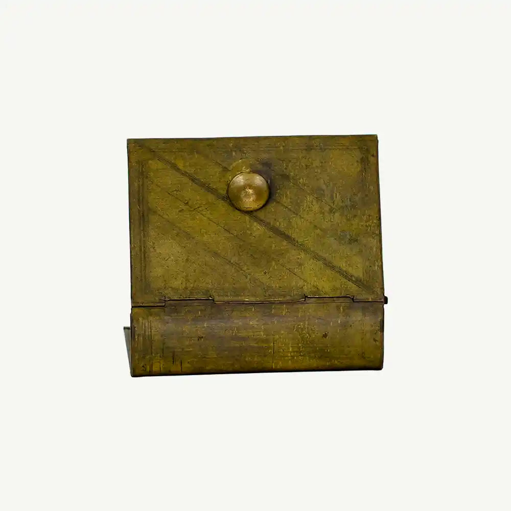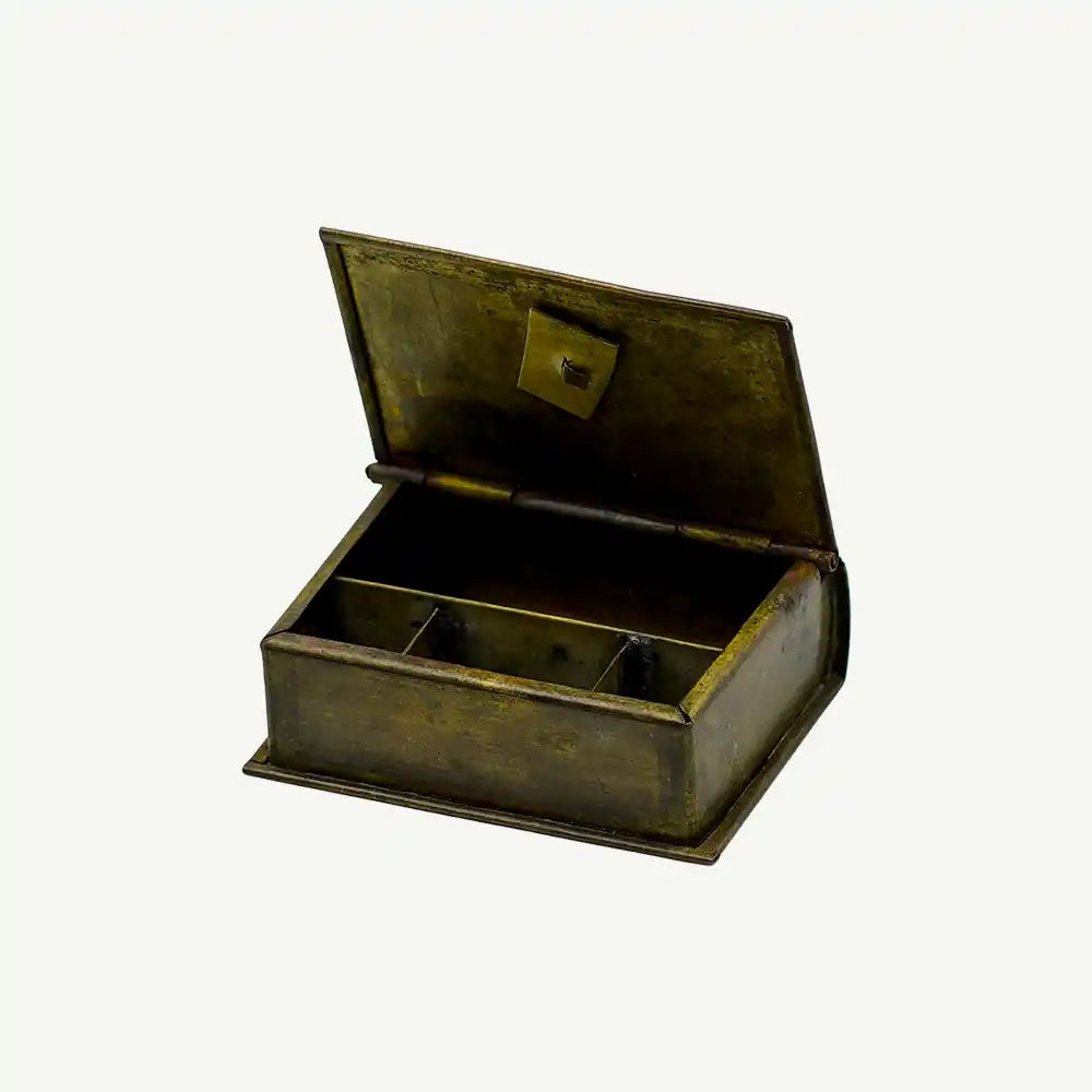 This is a remarkable vintage keepsake box, crafted from an oxidized metal, likely brass or bronze. The rectangular form is simple yet elegant, and the lid is adorned with a faded, intricate pattern that suggests fine craftsmanship. The aged patina and the visible latch give it a tangible sense of history, evoking a feeling of finding a treasured object from a bygone era. It's an ideal piece for holding small personal items, jewelry, or simply serving as a rustic decorative element.