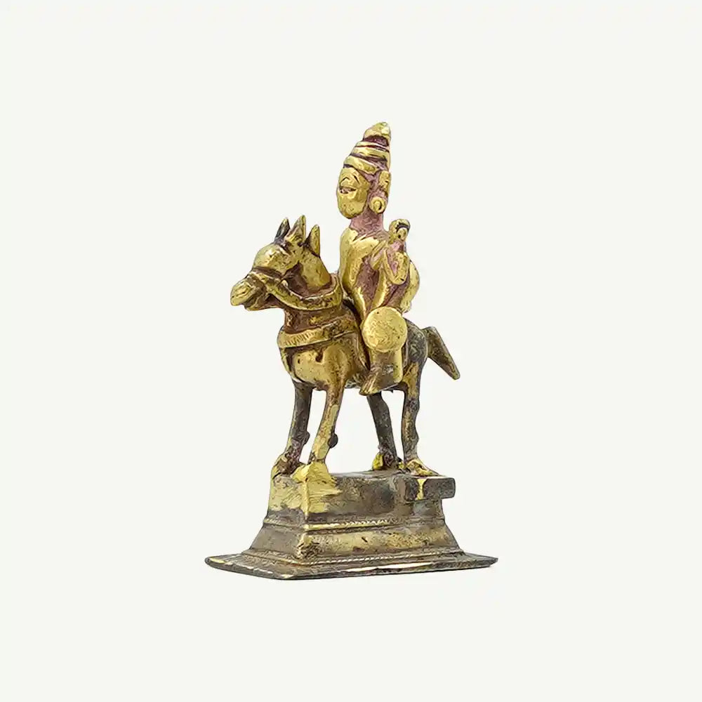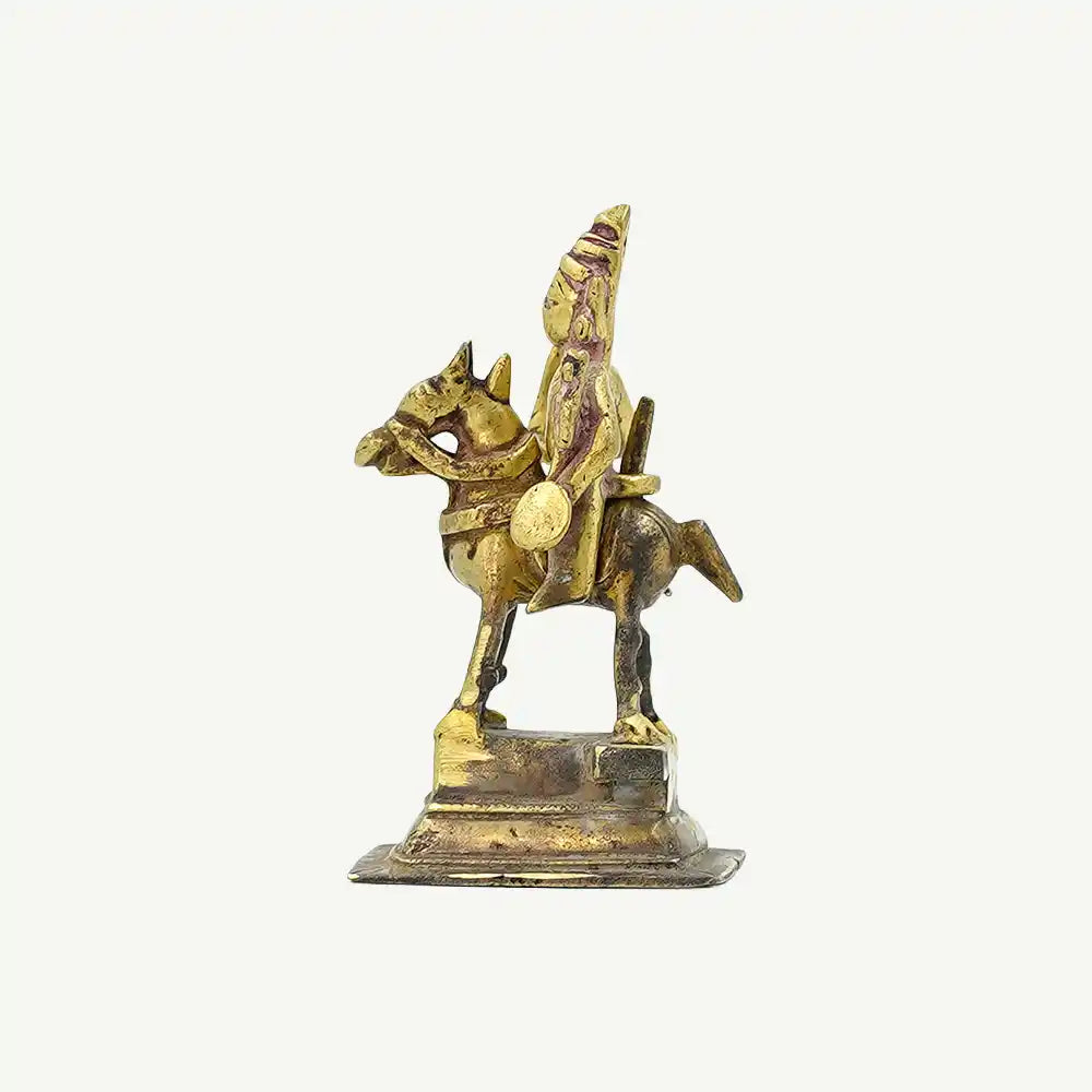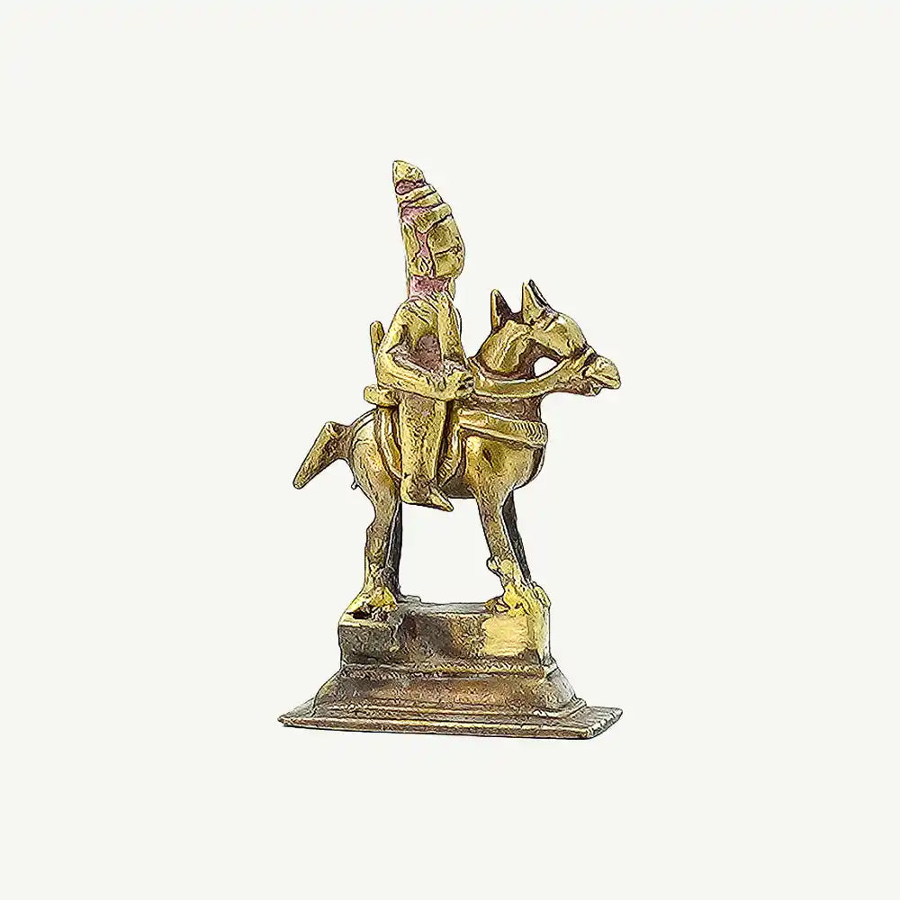 This is a remarkable, two-part statue of a rider and their horse, capturing a sense of partnership and motion. Crafted from oxidized metal with an antique patina, the piece has an elegant, aged appearance. A key feature of this artifact is its unique design: the rider is detachable from the horse, allowing it to be displayed as a single unit or as two separate, compelling pieces. The statue evokes a sense of journey, historical bravery, or a profound companionship, making it a captivating item for collectors and enthusiasts of unique artifacts.