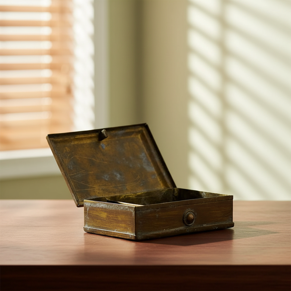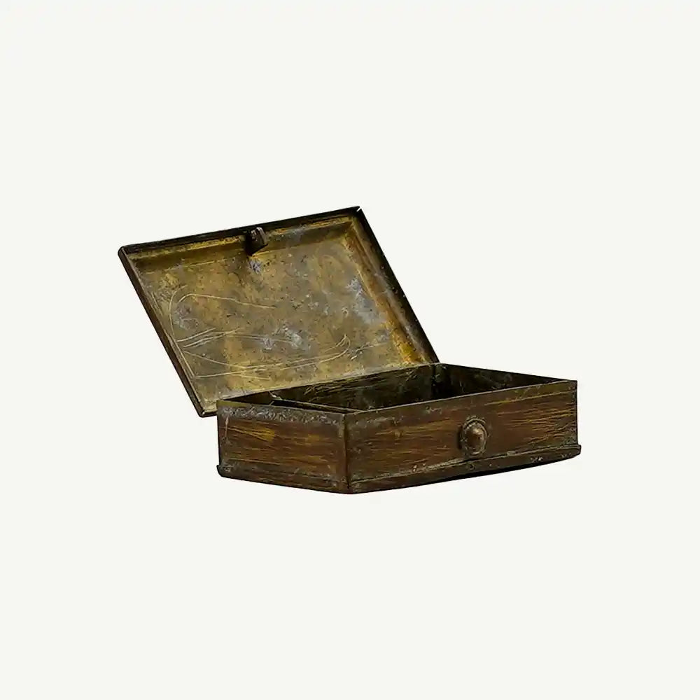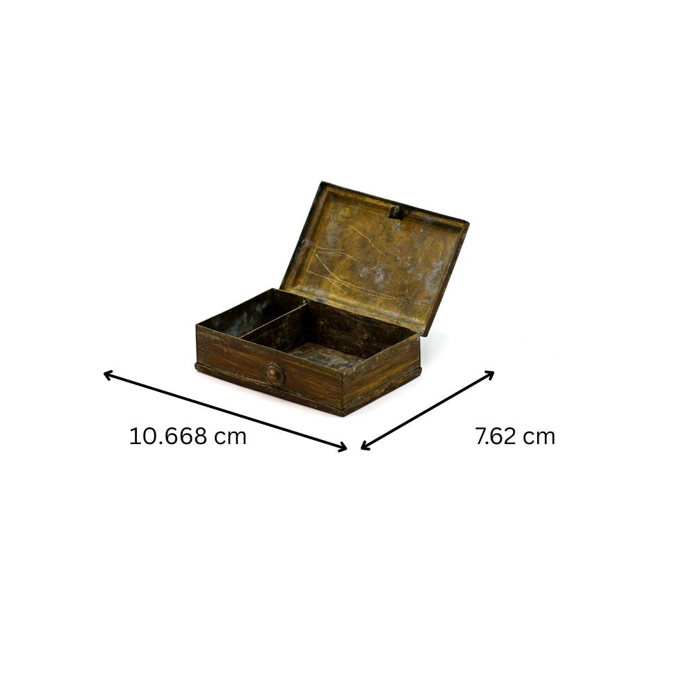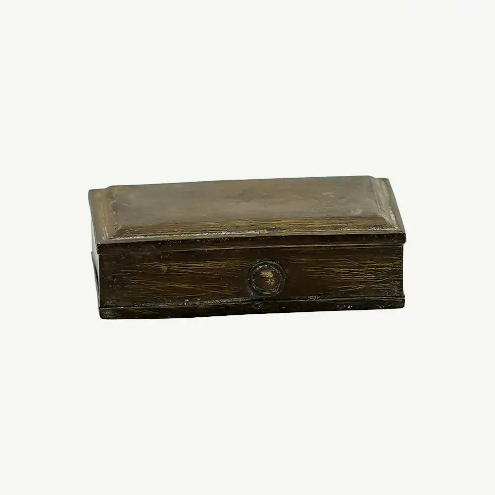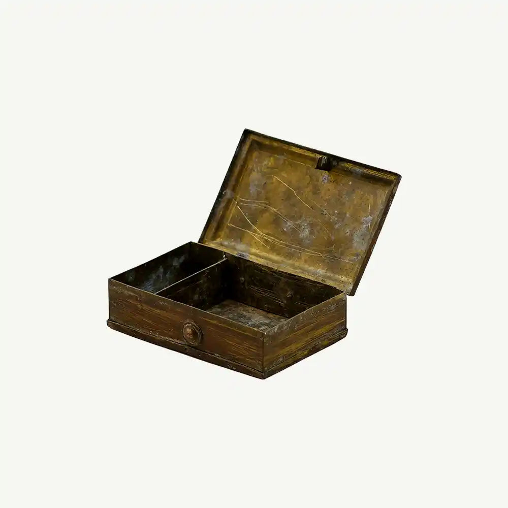 This is a sleek and elegant keepsake box crafted from oxidized metal, featuring a minimalist rectangular design. The most striking detail is the simple, polished stud on the lid, which also serves as a handle. The box's clean lines and smooth, aged patina give it a refined sense of history and craftsmanship. This item is perfect for holding small, treasured memories or jewelry, offering a discreet and beautiful way to store keepsakes.