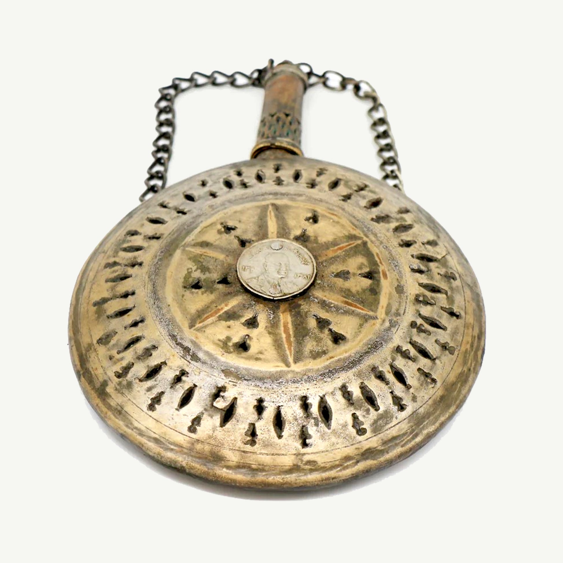 Add a rare and rustic piece to your collection with this vintage hand-crafted copper powder flask, featuring an ornate sunburst/star design, decorative pierced patterns, and a chain-linked stopper. The unique centerpiece—a coin embedded on the flask—adds historical character and charm, reflecting traditional craftsmanship from tribal or Middle Eastern origins.