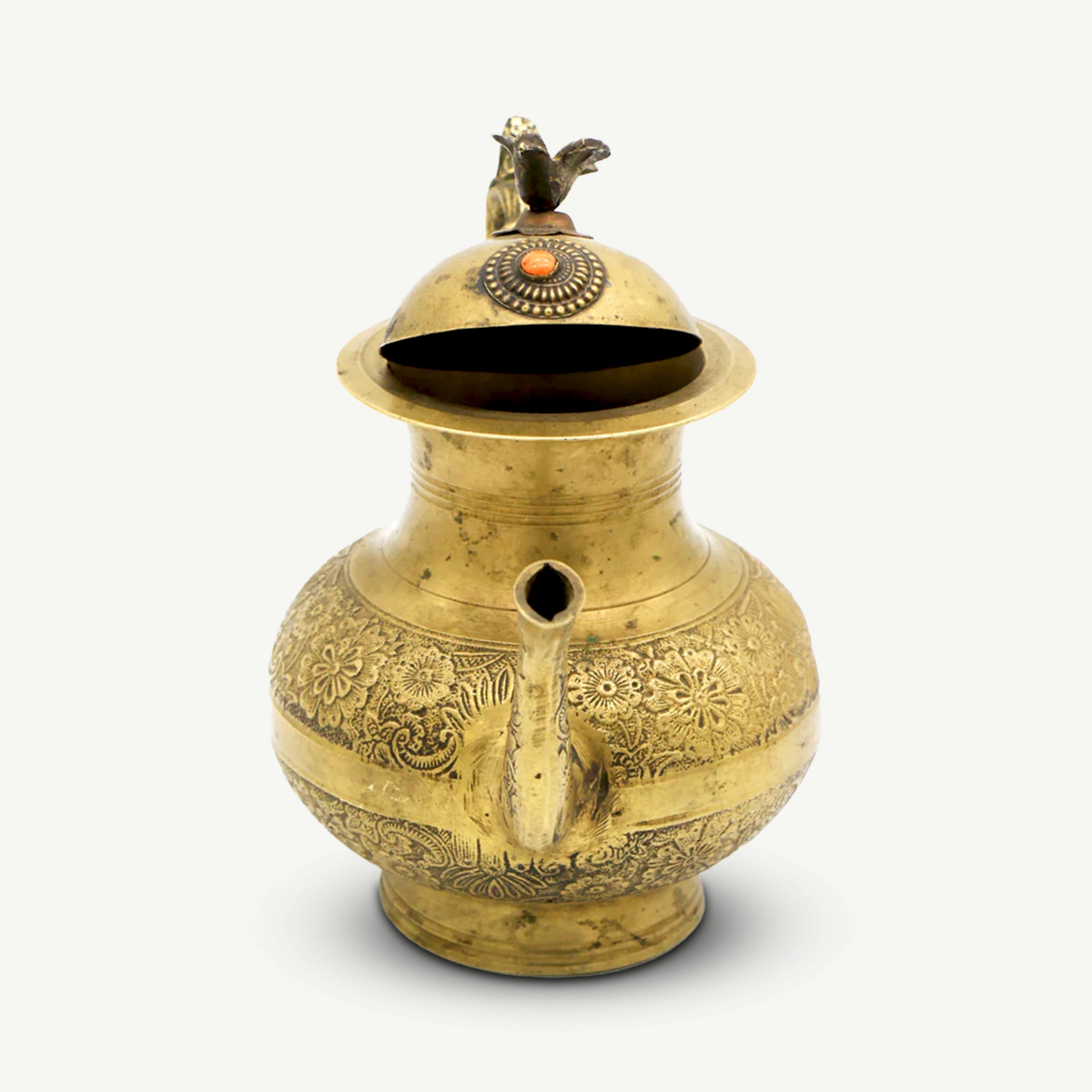 This Middle Eastern copper teapot is a masterful example of traditional metal artistry, featuring hand-engraved floral patterns that wrap around its rounded body. The ornate handle is sculpted with intricate curves, while the lid is crowned with a charming bird finial and adorned with decorative turquoise and coral-colored inlays.