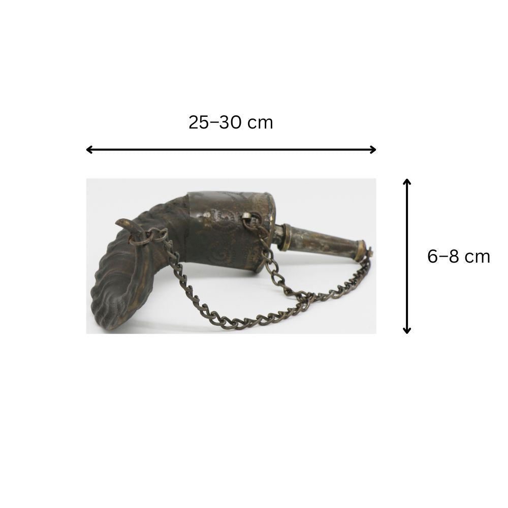 Add an authentic touch of heritage to your collection with this vintage handcrafted powder flask, made from natural horn and finished with detailed metalwork and a rustic chain. Historically used to carry gunpowder in the age of muskets and flintlock rifles, this flask reflects the utilitarian artistry of tribal Middle Eastern gun-smithing traditions.