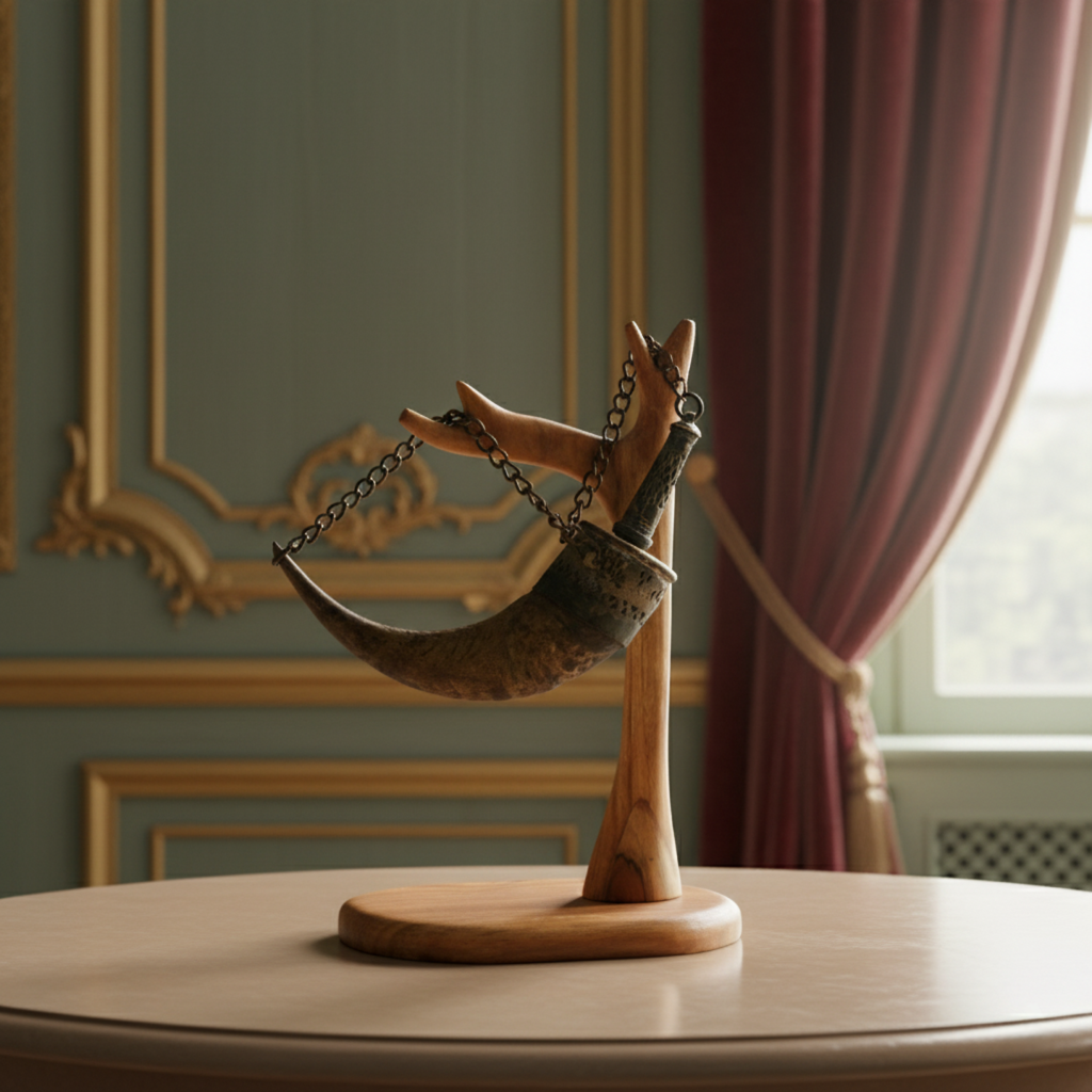 Design: Curved horn body with metal spout, chain, and pierced cap