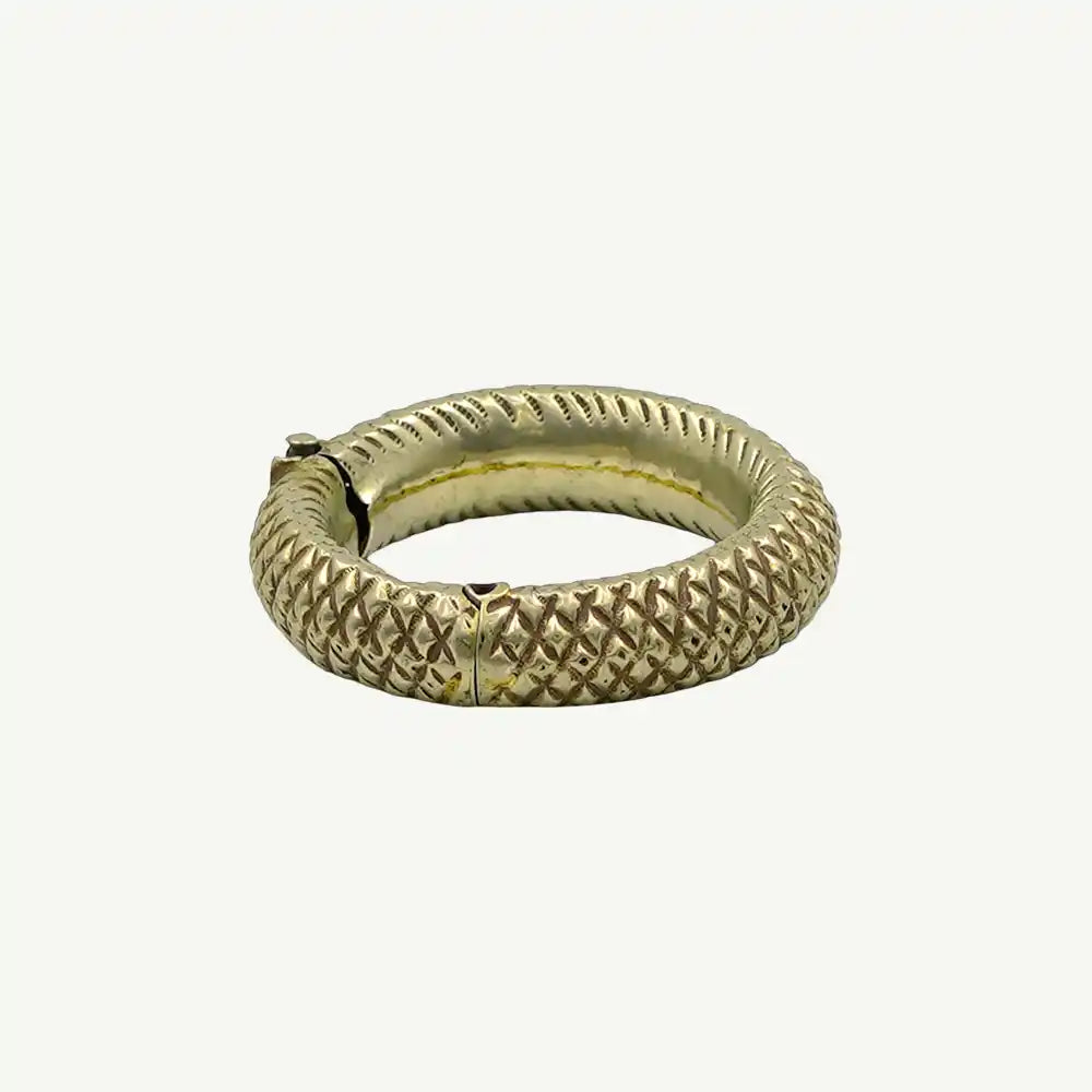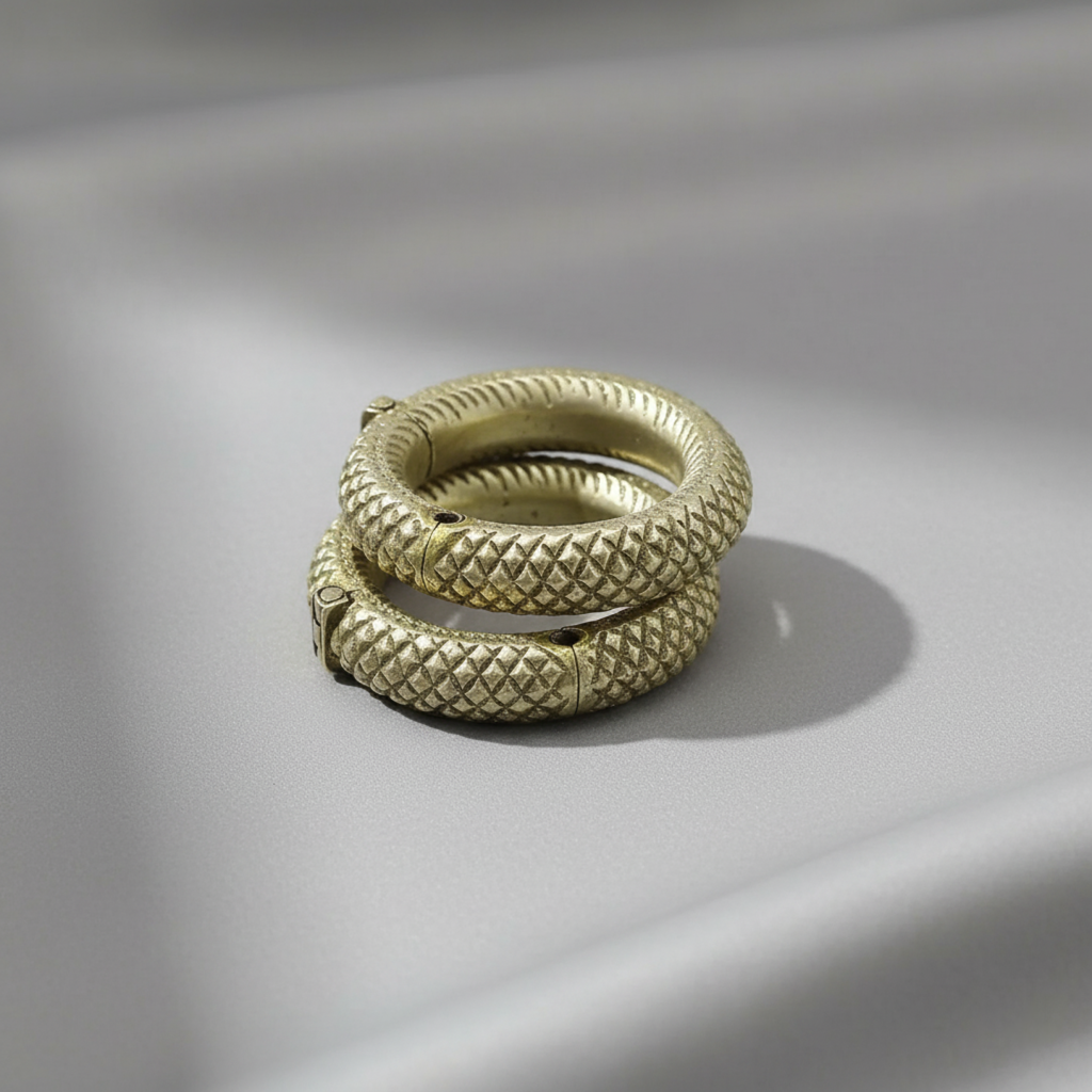 Acquire a piece of Indian heritage with this Vintage Solid Brass Traditional Anklet or Kada (bracelet). This unique piece of jewelry features a solid, heavy metal band with a textured, rope-like or braided design across its outer surface. The item has a hinged opening with a simple pin closure, highlighting its handcrafted origin and age. The heavy brass metal has naturally acquired a deep, warm patina.