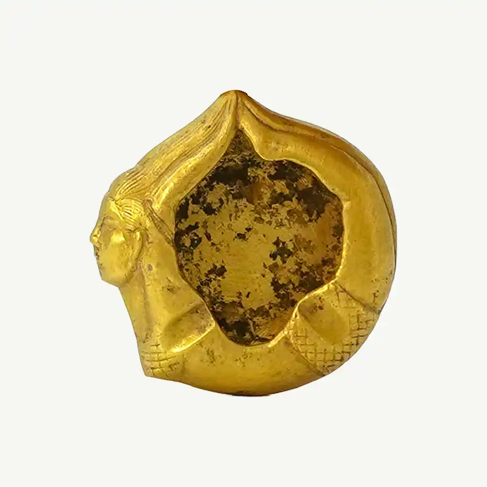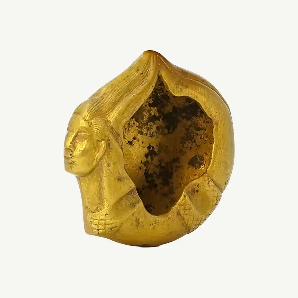 Acquire a piece of Indian heritage with this Vintage Solid Brass Traditional Ashtray. This unique vessel features a broad, shallow bowl with a flattened, decorated rim. The heavy brass metal is intricately adorned with detailed etched or low-relief patterns and has naturally acquired a deep, warm patina, highlighting its handcrafted origin and age.